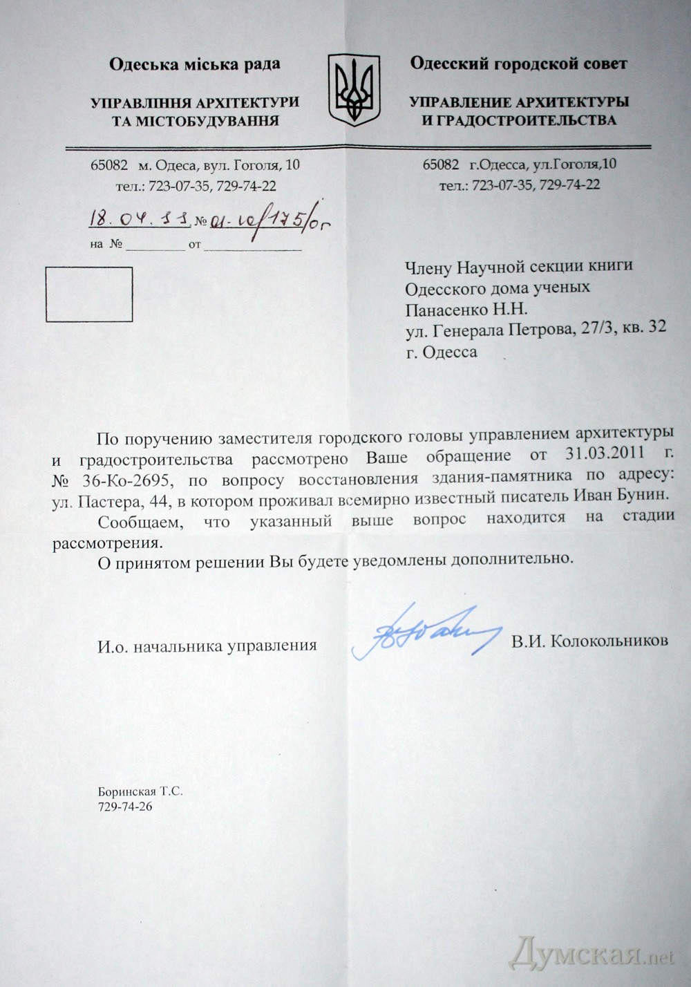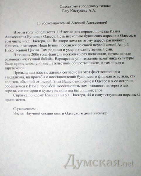 Уже более пяти лет одесситы обращают внимание властей города на факт уничтожения дома по улице Пастера, 44, где в 1898 году, сразу после венчания в Сретенской церкви проживали супруги Иван Бунин и Анна Цакни.
