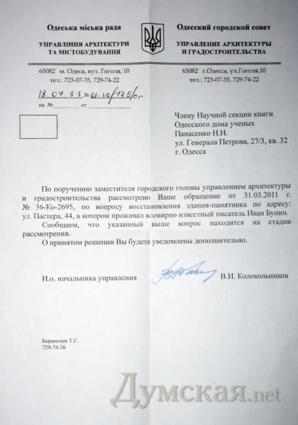 По словам секретаря научной секции книги Дома ученых Натальи Панасенко, это не более чем очередная отписка. «Мы опасаемся, что дальнейшее попустительство одесских властей приведет к тому, что дом, в котором жил великий писатель, навсегда исчезнет с карты города».