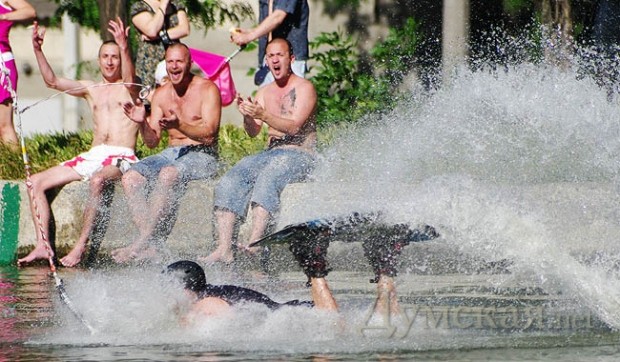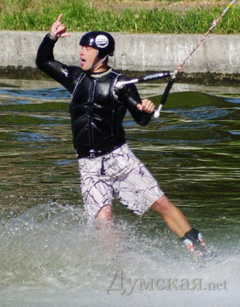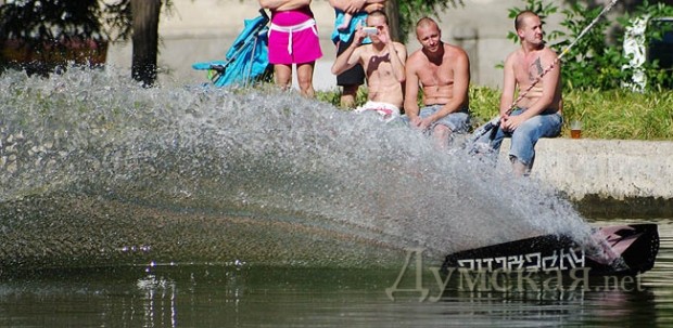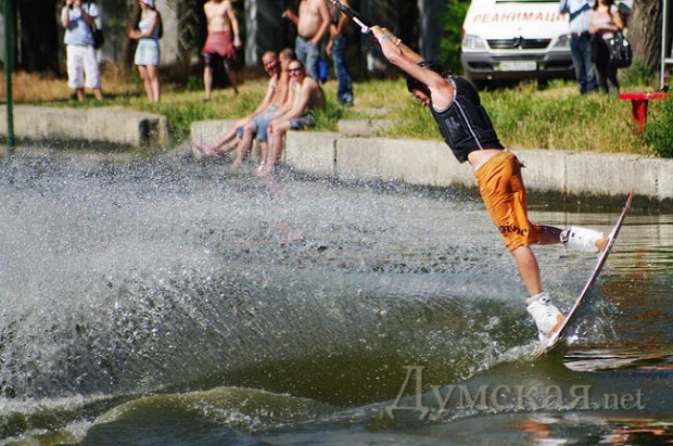 читайте внимательно — Соревнования — первый этап кубка Украины по вейкбордингу — проходят в пруду Дюковского парка Одессы.