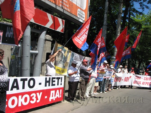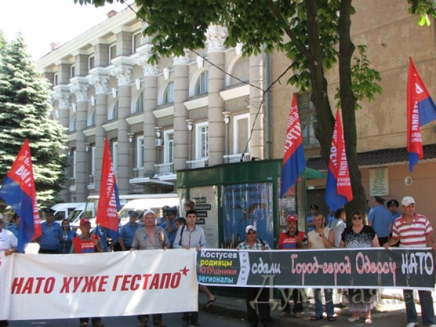 Активисты Прогрессивной социалистической партии Украины и партии «Киевская Русь», являющиеся противниками проведения в Одесской и Николаевской областях международных военных учений «Си Бриз», провели акцию протеста возле Дома офицеров на ул. Пироговской в Одессе.