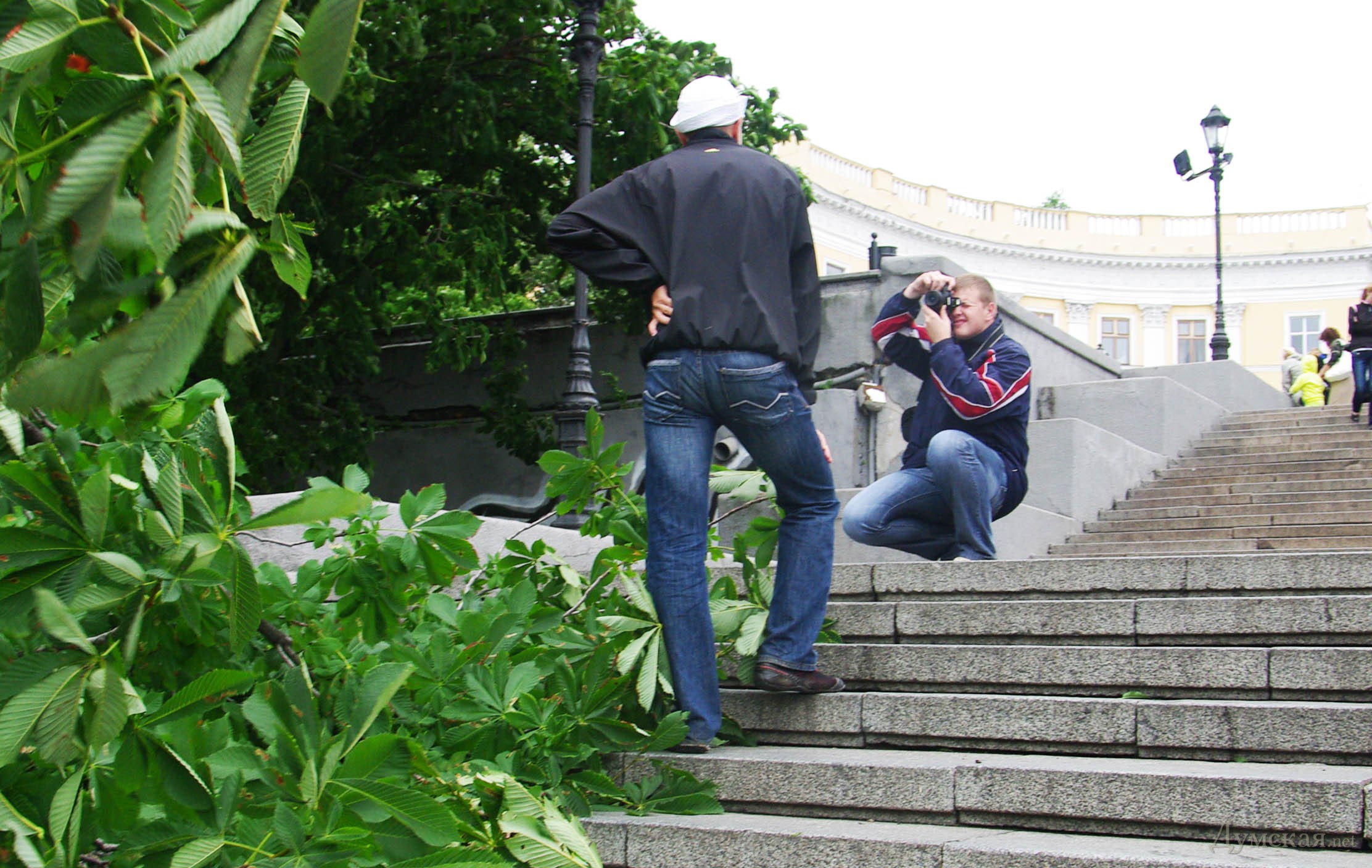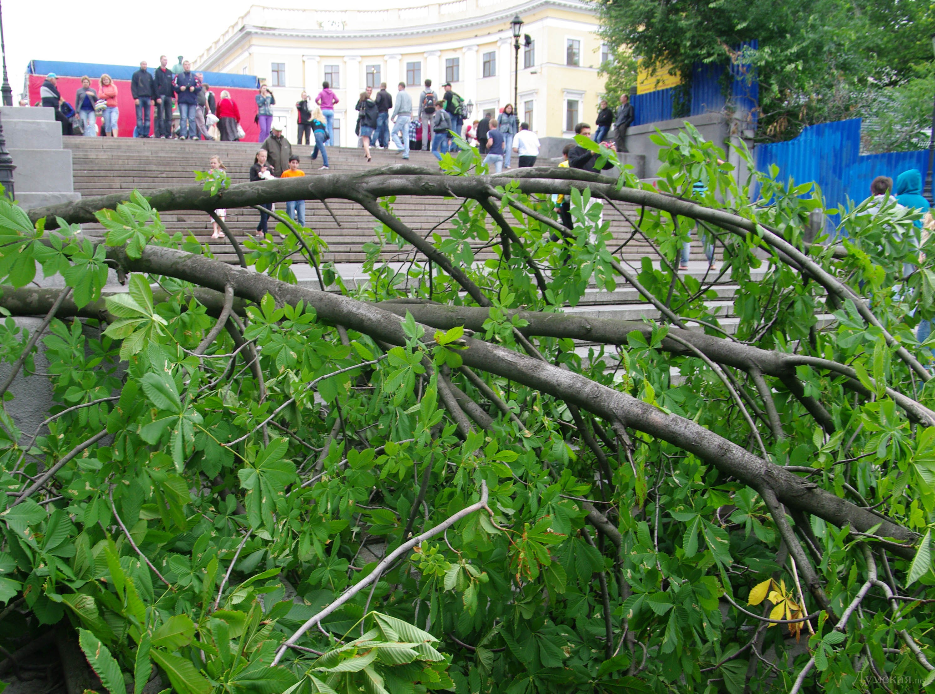 Наш фотокорреспондент запечатлел момент, как туристы фотографируются на фоне дерева, упавшего на Потемкинскую лестницу. Как сообщала «Думская», только по официальным данным ураган, прошедший над Одессой, снес более 500 деревьев.