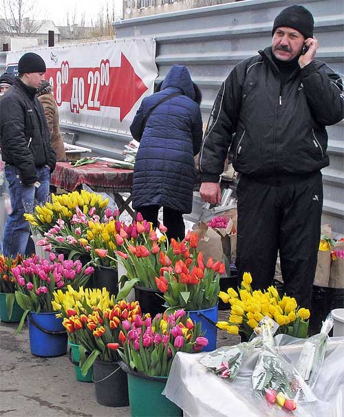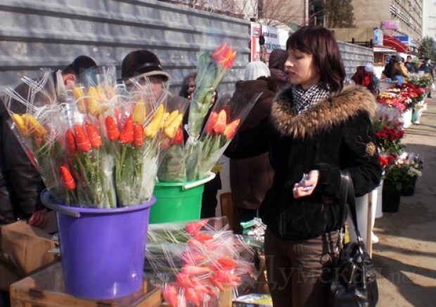 В этом году цветочный бум на рынках Одессы начался еще за несколько дней до Международного женского дня. Продавцы цветов уверяют, что дни перед 8 марта являются самыми прибыльными за весь год - по этому показателю с Женским днем не сравнятся ни новогодние праздники, ни День учителя, ни даже 1 сентября. Накануне женского праздника цены на цветы поднялись практически в два раза. Самыми дорогие из наиболее ходового товара — тюльпаны и розы.