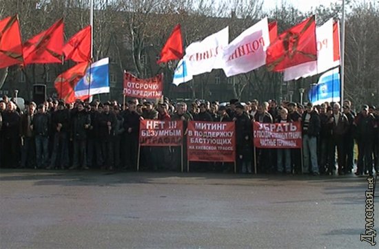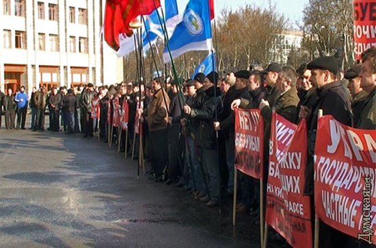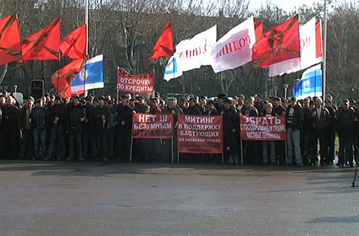 В эти минуты возле здания облгосадминистрации проходит митинг, организованный водителями-дальнобойщиками. Они поддерживают своих коллег, которые сегодня объявили предупредительную забастовку и выстроили автомобили на Киевской трассе. Основные требования митингующих - уменьшение таможенных сборов, предоставление отсрочки по кредитам за купленные автомобили, снижение штрафов, а так же дальнобойщики требуют убрать с государственной границы частные терминалы. В митинге принимают участие около 250 человек. СМЕРТЬ РОССИЙСКИМ ОККУПАНТАМ! Заметили ошибку? Выделяйте слова с ошибкой и нажимайте control-enter |