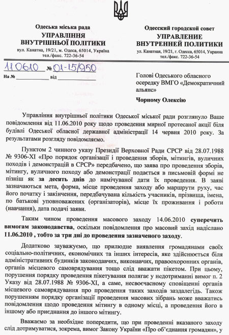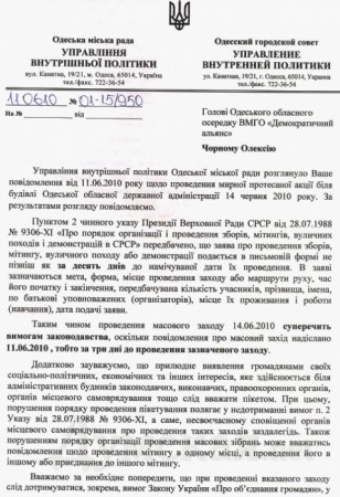 В Одессе организаторам акции в ответ на их заявку было отправлено письма с сообщением, что запланированная акция незаконна. Автор письма, начальник управления внутренней политики Одесского городского совета ссылался на указ президиума Верховной Рады УССР от 1988 года «О порядке организации и проведения собраний, митингов, уличных акций и демонстраций в СССР». Согласно этому документу, заявление о проведении собрания направляется за десять дней до намеченной даты проведения. «Таким образом, проведение массового мероприятия 14 июня 2010 года противоречит требованиям законодательства, поскольку сообщение о массовом мероприятии прислано 11 июня 2010, то есть за три дня до проведения указанного мероприятия», — говорится в письме. В свою очередь, статья 39 Конституции не регулирует во времени направление заявки на проведение акции, а ограничение права граждан проводить собрания и митинги устанавливается лишь судом. Кроме того, в письме, подписанным А.Крупником, начальником управления внутренней политики горсовета, одесский чиновник предупредил организаторов акции об уголовной ответственности. «Из содержания присланного вами сообщения усматривается, что проведение указанного мероприятия может привести к нарушению общественного порядка. Поэтому считаем необходимым предупредить, что согласно статье 293 Уголовного кодекса