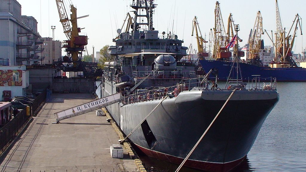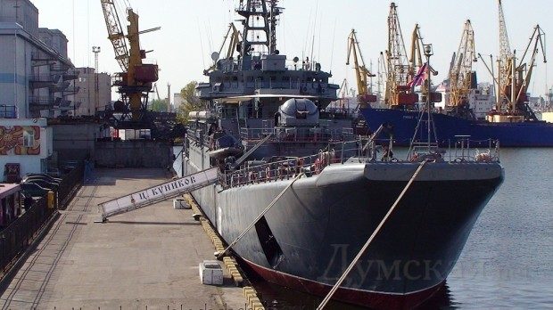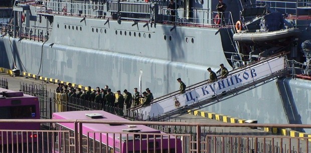 Сегодня утром в одесский морской порт зашёл военный корабль Российской Федерации «Цезарь Куников», на борту которого находтся российские морские пехотинцы. В День Победы, 9 мая, они примут участие в военном параде на Куликовом поле.
