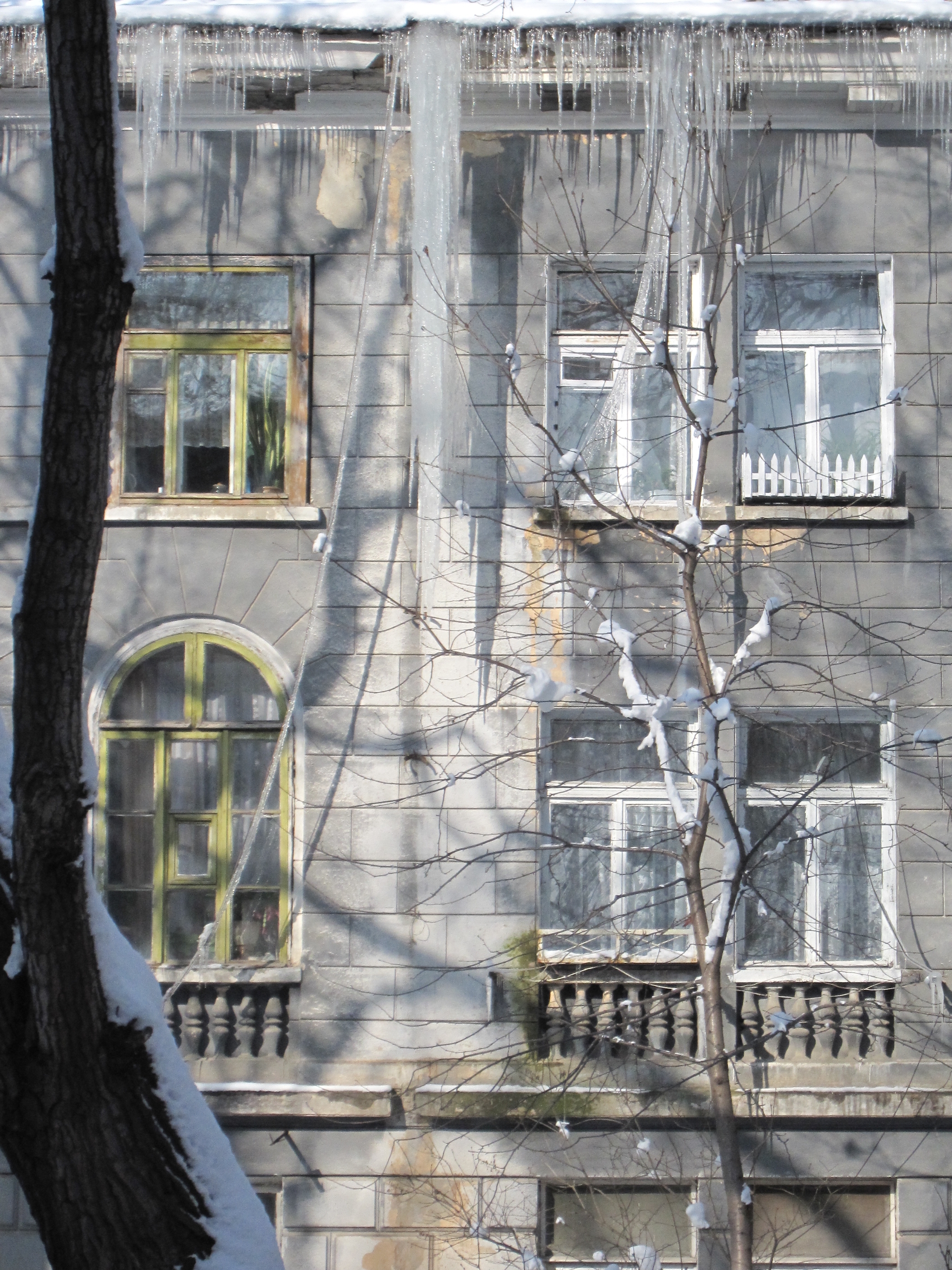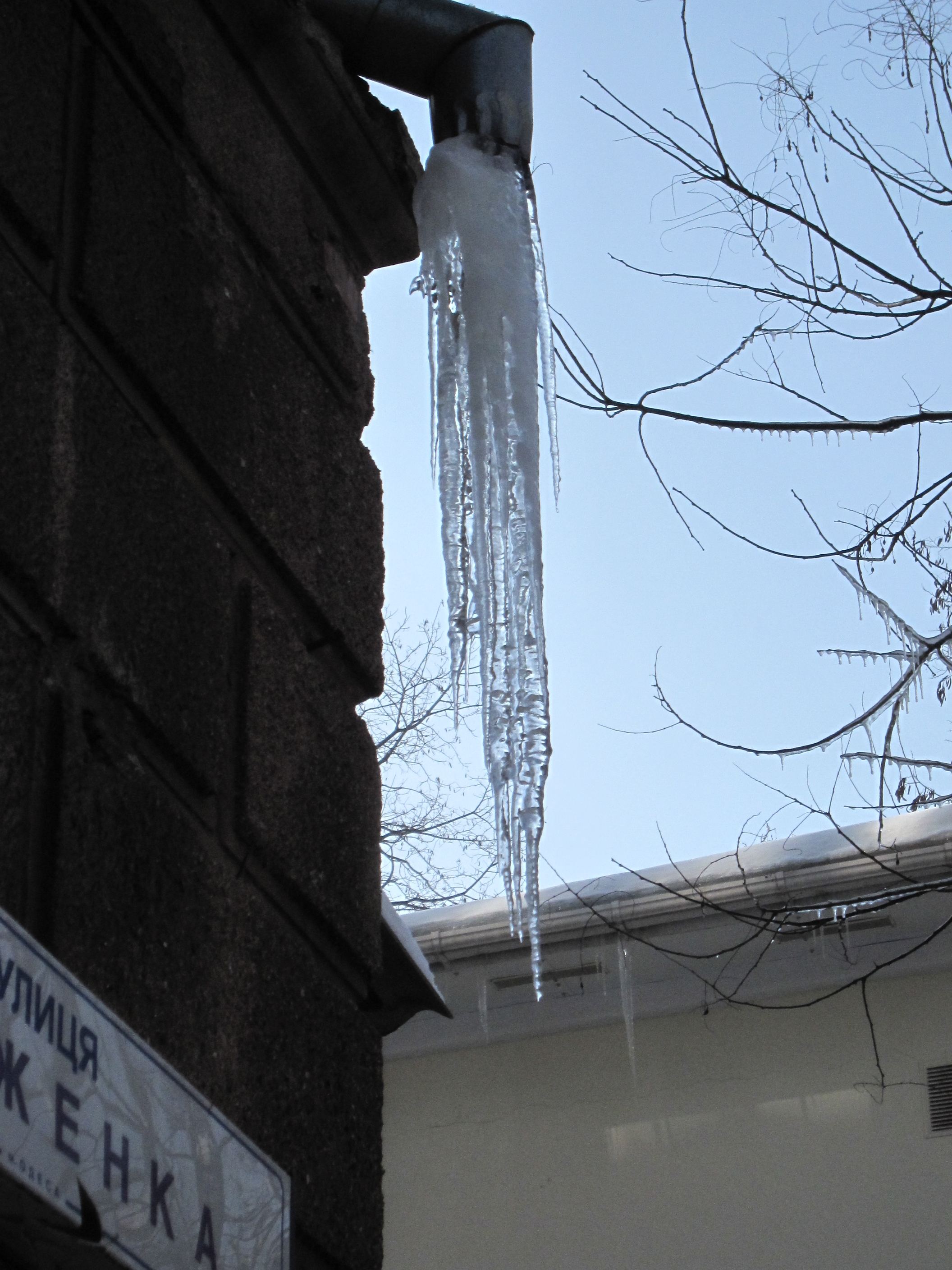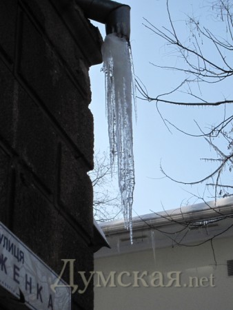 В Одессе держится специфическая погода. Днём на солнце поверхность прогревается до плюсовых температур, а в тени и ночью держится минусовая температура. Вследствие этого крыши домов обросли массивными сосульками, которые периодически срываются вниз.