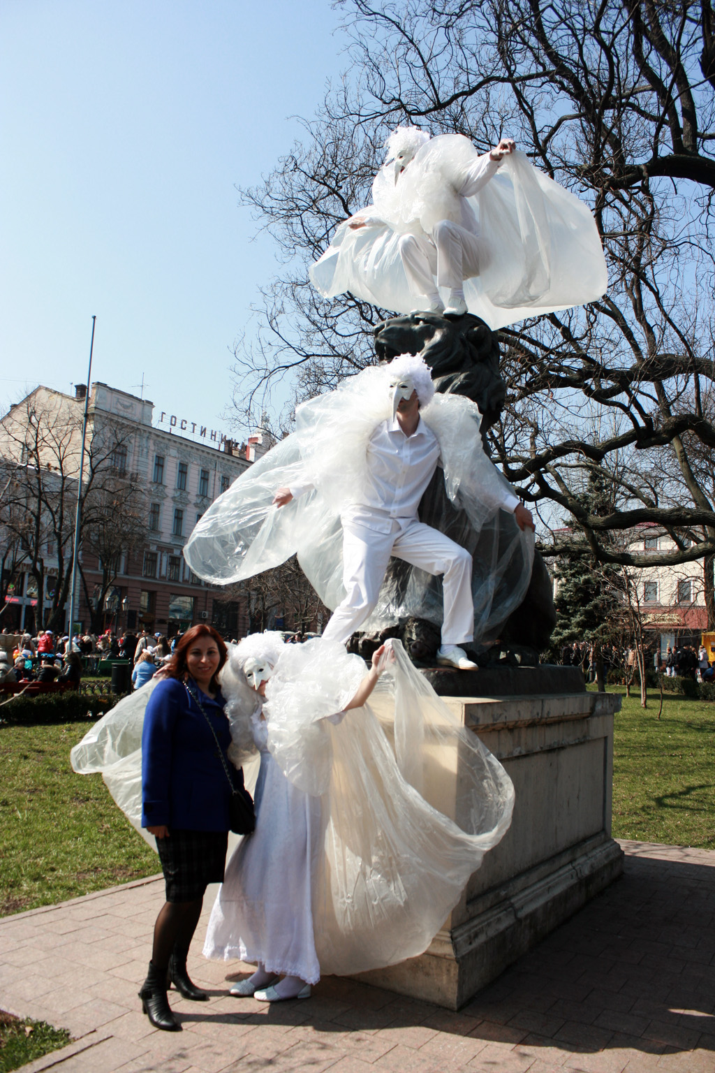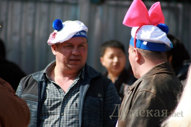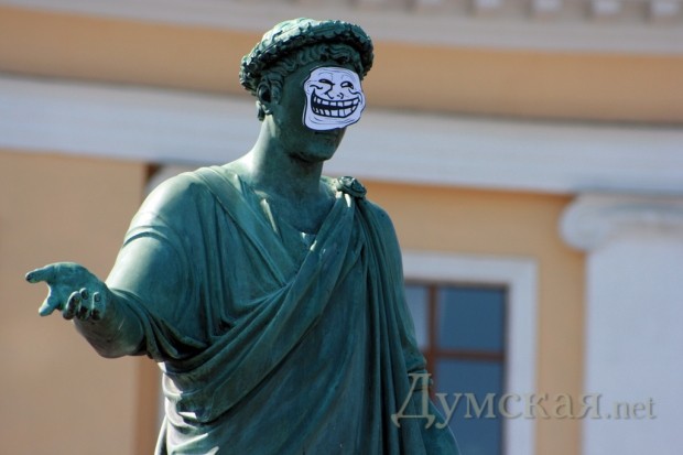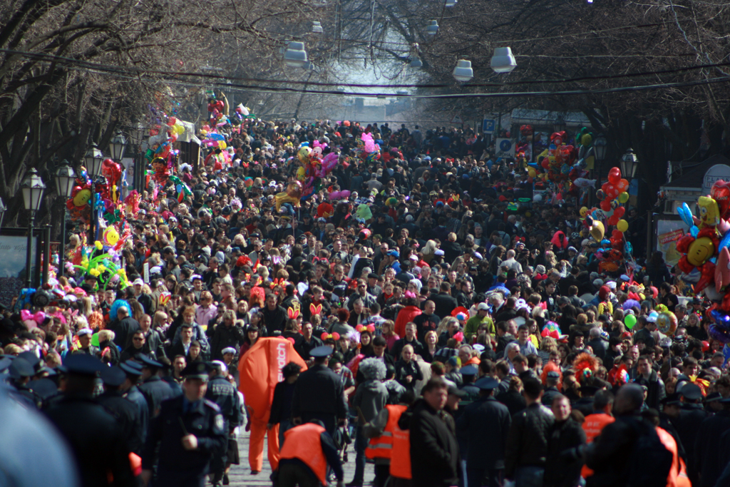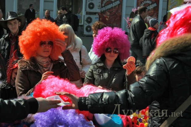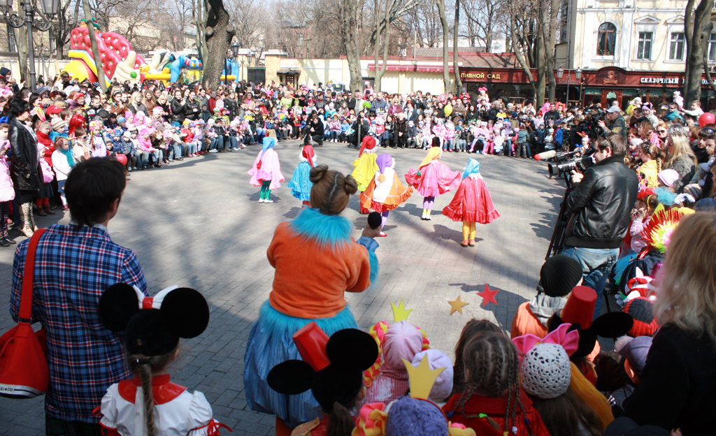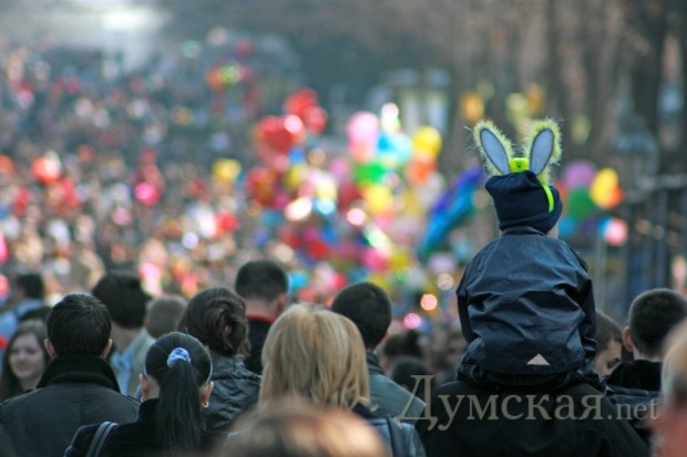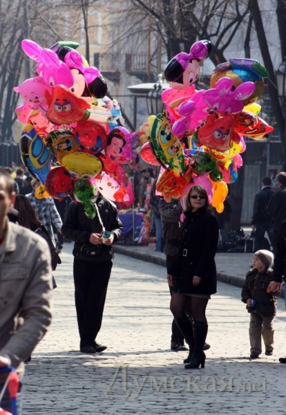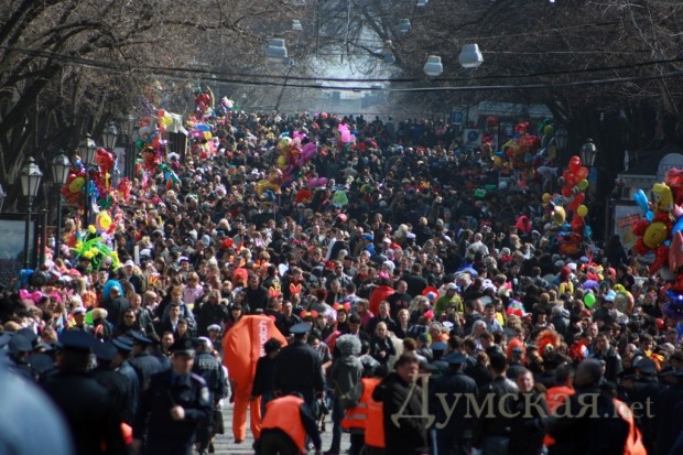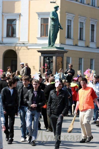 «Одесса смеется! « Да уж действительно смешно когда толпа приезжих взрослых дядек одевают рога и клоунский нос и спешат в Одессу в расчете увидеть по-настоящему, что то веселое)).