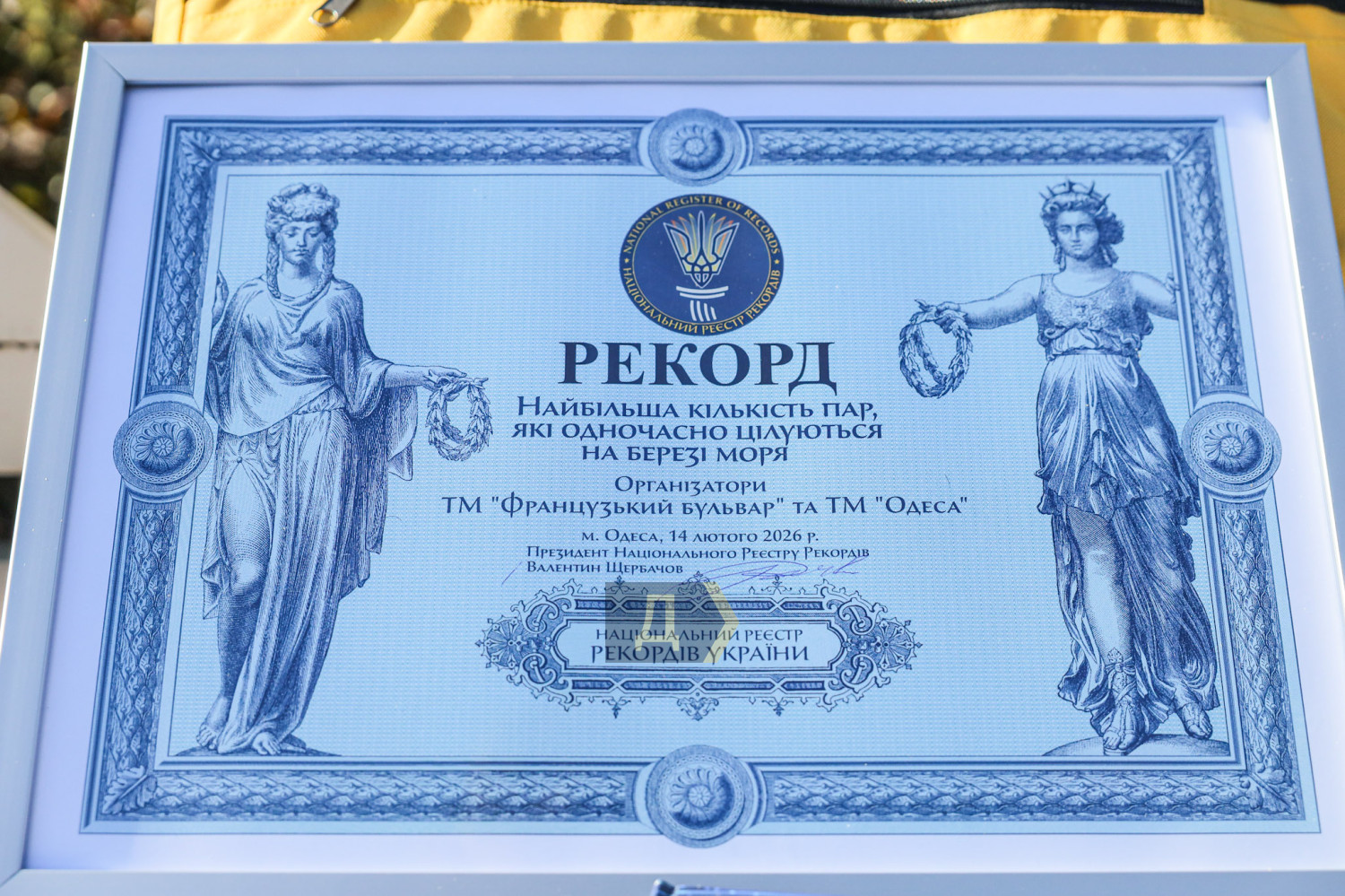 Національний рекорд за кількістю пар, які одночасно цілуються, встановили сьогодні в Одесі на березі моря в районі Малого Фонтану. З'єднати свої губи на п'ять хвилин зважилися 29 пар.