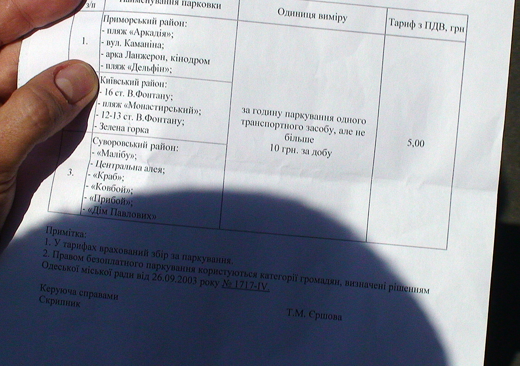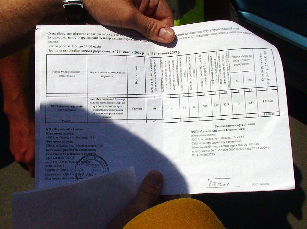 В «прибрежную зону» «Парксервис-Одесса» записал территории, расположенные далеко от моряУже больше года общественное объединение «Качество жизни» проводит рейды по парковкам города. В пятницу «паркинг-патруль» побывал на одной из самых «болезненных», по словам руководителя этой организации Алексея Гончаренко, парковок, а именно — в районе Аллеи Славы. Несмотря на то, что, согласно решению горисполкома №861 от 24 июня 2008 года это место не попадает в так называемую прибрежную зону, и час парковки здесь должен стоить 1 гривню, обслуживающее территорию СПД, при попустительстве КП «Парксервис», собирает по 5 и 10 грн. Интересен также тот факт, что в городской бюджет вне зависимости от стоимости парковки, будь то 1, 5 или 10 грн, поступает фиксированно 51 коп. Алексей Гончаренко, озвучивая мнение простых одесситов, назвал такие действия одесских властей и учреждённого ими КП - вымогательством и мошенничеством. СМЕРТЬ РОССИЙСКИМ ОККУПАНТАМ! Заметили ошибку? Выделяйте слова с ошибкой и нажимайте control-enter