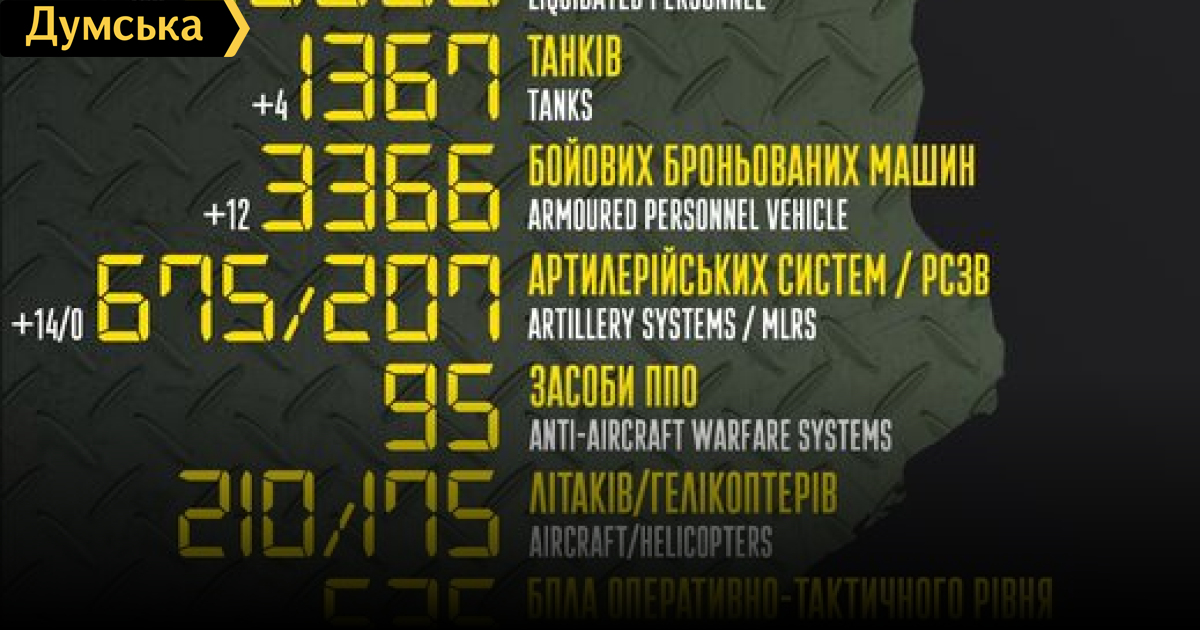 Российские нацисты за сутки потеряли в Украине сто человек, 14 артиллерийских систем и четыре танкаСто солдат, четыре танка и одну крылатую ракету потеряли российские нацисты за минувшие сутки в Украине. Кроме того, как сообщает Генштаб Вооруженных сил, украинские защитники уничтожили 12 боевых бронированных машин, 14 артиллерийских систем, 14 БПЛА оперативно-тактического уровня, четыре единицы автомобильной техники. Всего с начала полномасштабного вторжения потери врага составили: личного состава — 30 950 человек; танков — 1367 единиц; боевых бронированных машин — 3366 единиц; артиллерийских систем – 661 единица; РСЗО — 207 единиц; средства ПВО - 95 единиц; самолетов – 210 единиц; вертолетов – 175 единиц; БПЛА оперативно-тактического уровня – 535; крылатые ракеты — 121; корабли/катера — 13 единиц; автомобильной техники и автоцистерн — 2329 единиц; специальная техника – 51. СМЕРТЬ РОСІЙСЬКИМ ОКУПАНТАМ! Помітили помилку? Виділяйте слова з помилкою та натискайте control-enter |