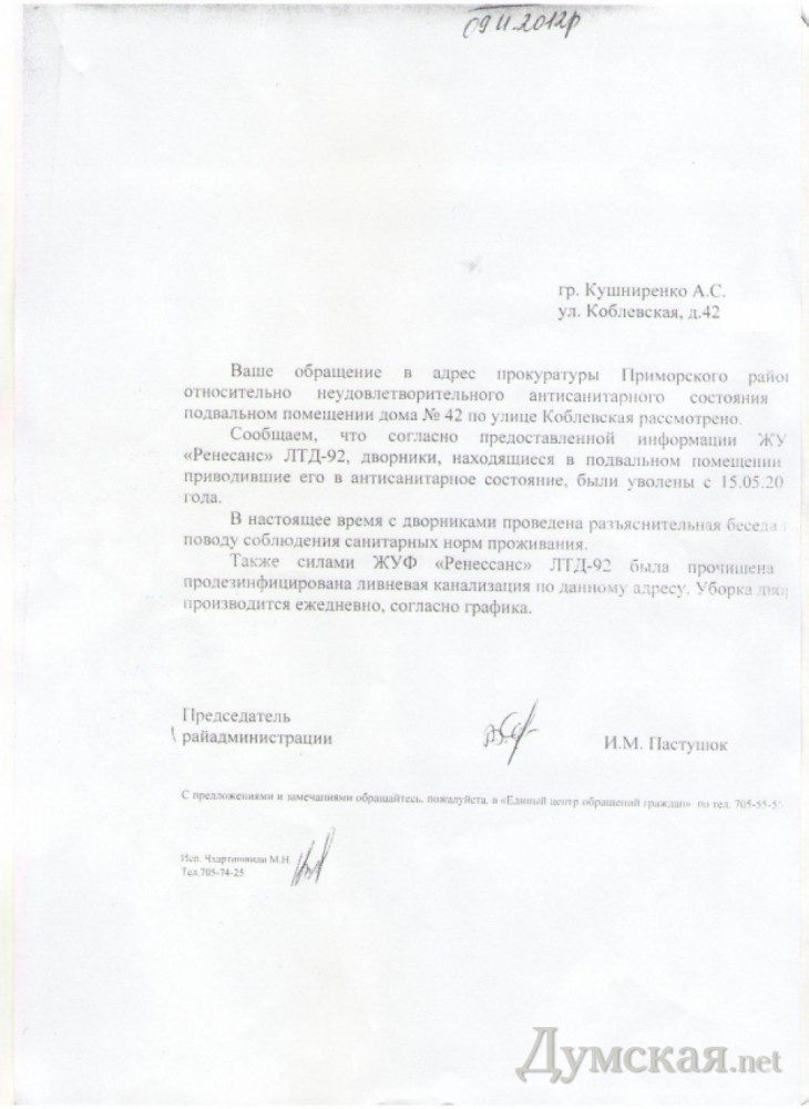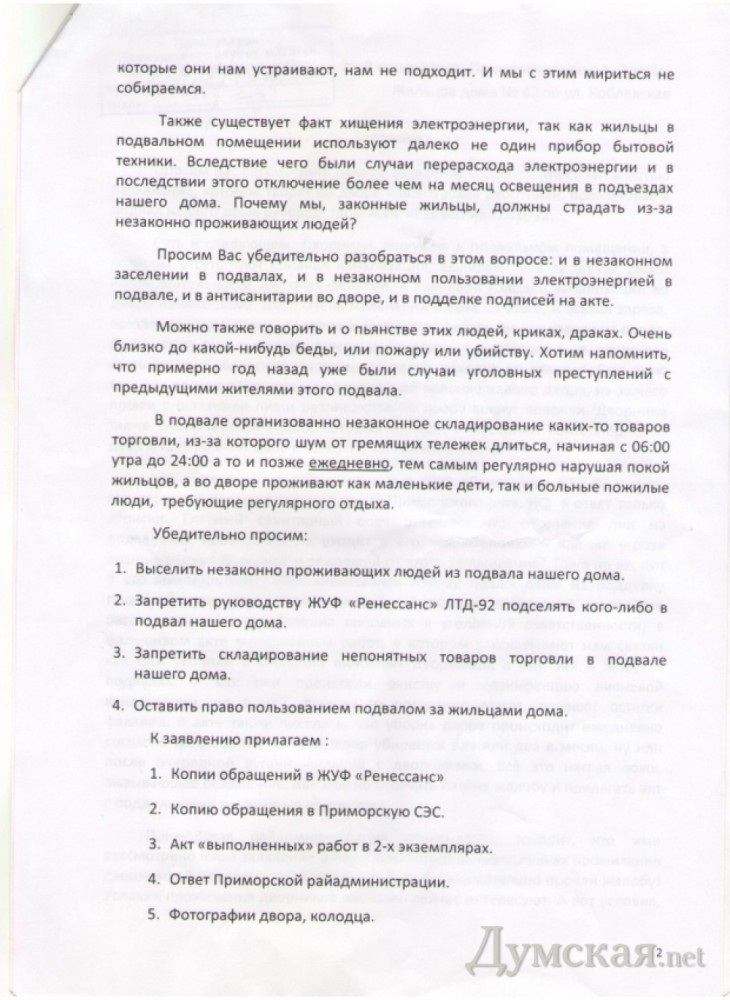 Двор в центре Одессы превратили в свалку: жильцы возмущены, чиновники не реагируютУже более года жители двора на Коблевской вынуждены соседствовать с бомжами, которых к ним подселил ЖКС. Бездействие чиновников заставило одесситов обратиться в прокуратуру. Как сообщает организация «Общественный контроль», год назад ЖКС «Ренессанс» поселил в подвал дома №42 «дворников», которые вместо того, чтобы содержать двор в чистоте, заливают его помоями и свозят сюда хлам. «В данном подвальном помещении нет никаких условий для проживания, а именно, нет водопровода и, самое главное, нет канализации. Все свои помои и фекалии они выливают в ливневый колодец, который находится посреди двора. Двор маленький и от колодца до ближайших окон жильцов — три метра. Не трудно себе представить, какая вонь стоит во дворе и в квартирах жильцов. Маленькие дети многих жильцов были вынуждены все лето дышать этой вонью. Кроме того, эти «поселенцы» собирают всякий хлам в мусорных баках, который они сносят и складируют в нашем дворе, — говорится в заявлении жильцов — Также в этом подвале организован склад каких-то предметов с мусорных контейнеров. Ежедневно грузчики с гремящими тачками разгружают и загружают эти коробки. Все это начинается с шести утра и может закончиться в полпервого ночи. И это каждый день без выходных». Когда жильцам надоело это терпеть, они обратились в ЖКС «Ренессанс» с просьбой повлиять на своих сотрудников, однако ответа на их запрос не последовало. Обращались жильцы, также, с заявлением в санэпидемстанцию, но СЭС переадресовала запрос в обладминистрацию, а та в свою очередь — в райадминистрацию и ЖКС. Все это длилось около двух месяцев. Наконец, из ЖКСа ответили, что уже «провели беседу с жильцами подвала» и уволили тех на кого жаловались одесситы. Однако жильцы дома утверждают, что контингент в подвале не изменился. «Последнее, что сделали отчаявшиеся люди — это написали заявление в прокуратуру, к которому приложили копии всех обращений и копии ответов. Также сделали фотографии всех этих безобразий. Под заявлением подписалось шесть квартир. Прошло уже пять недель, пока никакой реакции нет», — отметили в организации. По словам лидера «ОК» Сергея Дубенко, поскольку от чиновников и правоохранителей никакой помощи в пустяковом вопросе жильцам не поступило, общественники взялись помочь одесситам в решении данного вопроса. СМЕРТЬ РОСІЙСЬКИМ ОКУПАНТАМ! Помітили помилку? Виділяйте слова з помилкою та натискайте control-enter |