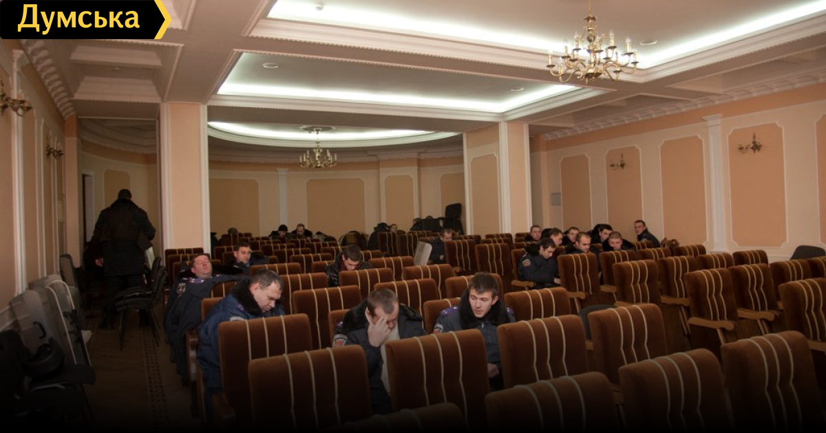 В кинозале мэрии отдыхают несколько десятков милиционеров.