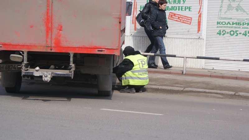 А что это там стремный парковщик около машины на корточки присел? Бензин сливает?!