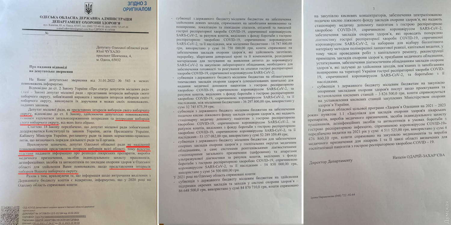 Депутату Одесского облсовета не дают информацию об использовании средств из фонда борьбы с ковидом: говорят, что избирателям на округе это знать необязательно (документ)Неожиданный ответ получила на свой запрос депутат Одесского областного совета от «Европейской Солидарности», член постоянной комиссии по здравоохранению Юлия Чухало. Она обратилась в департамент здравоохранения ОГА с запросом об использовании средств из фонда борьбы с коронавирусом и областной целевой программы «Здоровье Одесчины». Чиновники ответили, что, мол, депутат облсовета не представляет жителей всей области, а избирателям ее округа эта информация не нужна. Такой парадоксальный ответ содержится в официальном письме департамента, которое можно считать образцово-показательным примером «выборочного чтения». Авторы ответа (директор департамента Наталья Одарий-Захарьева и исполнитель Ирина Парамонова) весьма фривольно цитируют нормы Закона Украины «О статусе депутатов местных советов» и, по непонятной причине, упорно не замечают отдельных слов. В частности, они ссылаются на статьи 2 и 8 закона. В них шесть раз упоминается, что депутат местного совета представляет всю территориальную громаду. Однако авторы ответа читают законы каким-то странным способом. Изучив эти нормы, они сообщили депутату, что она не представляет интересы всех жителей области, а только избирателей своего округа. Поэтому, по их глубокому убеждению, полномочий запрашивать информацию о приобретении лекарств, средств защиты и дезинфекции, изделий медицинского назначения депутат областного совета и член профильной комиссии не имеет. Справедливости ради следует отметить, что затем чиновники смилостивились и дали депутату некоторые цифры — жаль, не те, что у них запрашивали. В частности, они назвали суммы, полученные областью в виде субвенций из государственного бюджета, но даже не посчитали нужным дать детальные сведения о выполнении областной целевой программы, утвержденной депутатами. «По моей практике: когда чиновники боятся дать информацию, становится понятно, что они что-то скрывают, — комментирует ситуацию Юлия Чухало. — Интересно, что они пытаются скрыть на этот раз?» Отметим: часть 1 статьи 351 Уголовного кодекса предусматривает наказание за такое препятствование деятельности депутата — вплоть до ограничения свободы на три года. По словам Чухало, раньше уже открыли производство по данной статье в отношении чиновника из Одесской области. Что характерно, в своем ответе, который стал основанием для уголовного расследования, он использовал те же странные аргументы, что и авторы ответа из департамента здравоохранения области. Депутат надеется, что произошло недоразумение, и эта ошибка исполнителя будет исправлена. Если нет - последует обращение в правоохранительные органы. СМЕРТЬ РОССИЙСКИМ ОККУПАНТАМ! Заметили ошибку? Выделяйте слова с ошибкой и нажимайте control-enter
