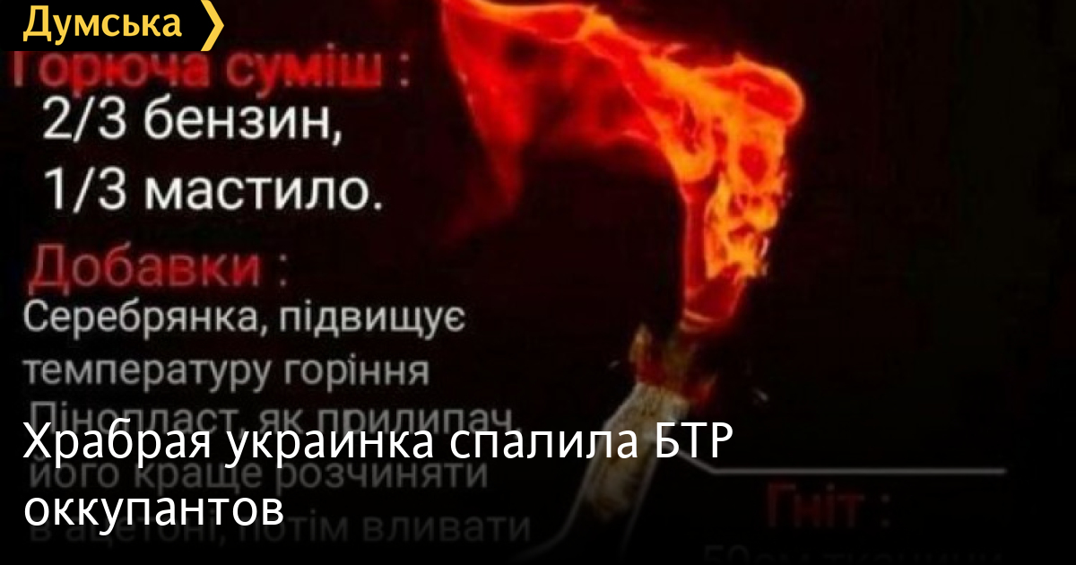 Жительница Харьковской области сама спалила БТР оккупантов. Об этом сообщает пресс-служба Вооруженных сил Украины. Женщина у себя дома изготовила «коктейли Молотова» и в одиночку пошла против вооруженных до зубов россиян. Ей удалось спалить вражеский БТР!