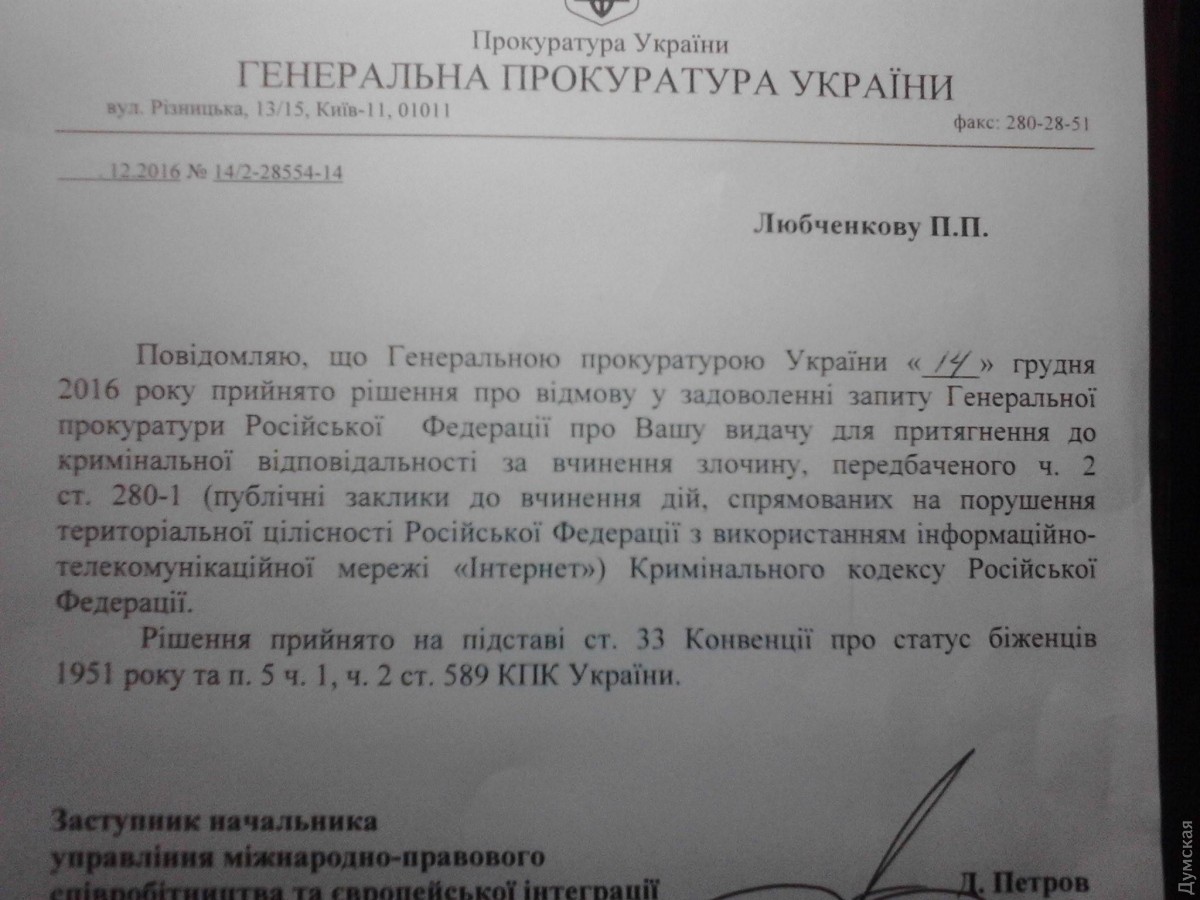 Генпрокуратура отказалась выдавать Москве «кубанского федералиста», укрывшегося в ОдессеГенеральная прокуратура отказалась передавать властям Российской Федерации политического беженца Петра Любченкова. Об этом стало известно из письма ГПУ, которое Любченков разместил на своей странице в «Фейсбуке». «Хорошая новость. ГПУ отказала Российской Федерации в выдаче меня в Российскую Федерацию. Вчера ходил в прокуратуру и получил уведомление об этом. Действительно, хорошая новость. Все это было долго и непросто», — написал он. Напомним, гражданина России, психолога Петра Любченкова на родине преследуют за политический троллинг: в августе 2014 года он вместе с Дарьей Полюдовой и Вячеславом Мартыновым объявил о проведении в Краснодаре «Марша за федерализацию Кубани» (является пока субъектом Российской Федерации). Инициаторов марша внесли в список «экстремистов и террористов» Росфинмониторинга, а затем обвинили в призывах к нарушению территориальной целостности России. Осенью 2014 года Петр Любченков выехал в Одессу, где попросил политического убежища. Увы, украинские власти не торопились давать статус беженца проукраинскому оппозиционеру. Более того, как выяснилось, миграционная служба обнаружила Петра в российских «черных списках» и сообщила об этом в прокуратуру Одесской области, которая в конце 2014 года по своим все еще действующим каналам передала информацию о месте пребывания Любченкова в ФСБ. В результате в России открыли против активиста уголовное дело и приняли решение о заключении его под стражу. Именно на этом основании Петру несколько раз отказывали в статусе беженца, и россиянину пришлось защищать свои права в суде. Только через полтора года, после четырех решений судов он получил защиту государства и возможность законно находиться на территории нашей страны. Как следует из письма ГПУ, генеральная прокуратура РФ направила в Украину запрос о депортации Любченкова, но получила отказ на основании ст. 33 Конвенции о статусе беженцев. Ранее политическое убежище в Украине получил другой «кубанский федералист» Вячеслав Мартынов, который перебрался в Харьков. Ему тоже понадобилось пройти через судебную тяжбу. Дарья Полюдова не успела покинуть Россию и была осуждена по ч. 2 ст. 280.1 УК РФ. Ее приговорили к двум годам колонии-поселения. Она стала вторым гражданином России, осужденным по этой статье. СМЕРТЬ РОСІЙСЬКИМ ОКУПАНТАМ! Помітили помилку? Виділяйте слова з помилкою та натискайте control-enter |