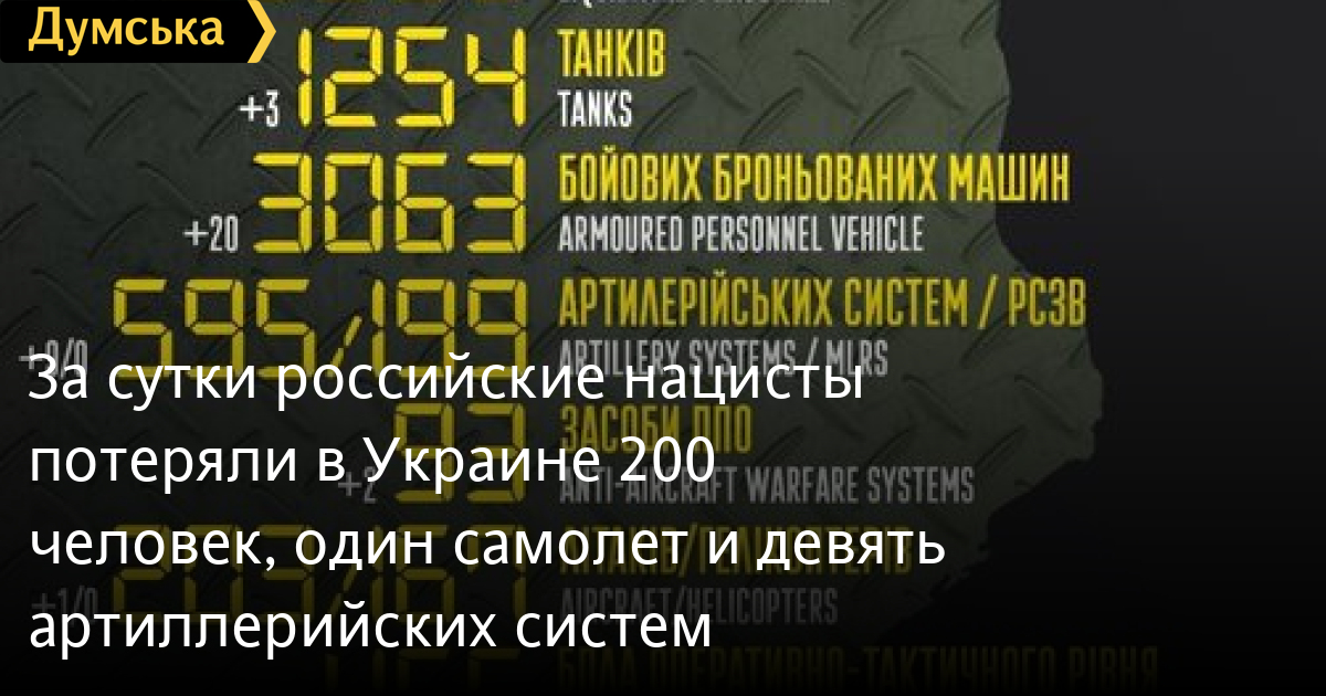 За сутки российские нацисты потеряли в Украине 200 человек, один самолет и девять артиллерийских систем200 солдат, один самолет и три танка потеряли российские нацисты за минувшие сутки в Украине. Кроме того, как сообщает Генштаб Вооруженных сил, украинские защитники уничтожили 20 боевых бронированных машин, девять артиллерийских систем, два средства ПВО, 14 БПЛА оперативно-тактического уровня и 20 единиц автомобильной техники. Всего с начала полномасштабного вторжения потери врага составили: личного состава — 28 500 человек; танков ‒ 1254 единицы; боевых бронированных машин ‒ 3063 единицы; артиллерийских систем – 595 единиц; РСЗО — 199 единиц; средства ПВО - 93 единицы; самолетов – 203 единицы; вертолетов – 167 единиц; БПЛА оперативно-тактического уровня – 455; крылатые ракеты — 103; корабли/катера — 13 единиц; автомобильной техники и автоцистерн — 2157 единиц; специальная техника – 43. СМЕРТЬ РОССИЙСКИМ ОККУПАНТАМ! Заметили ошибку? Выделяйте слова с ошибкой и нажимайте control-enter |
