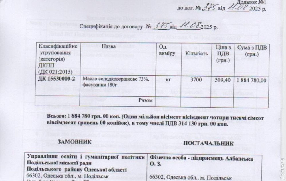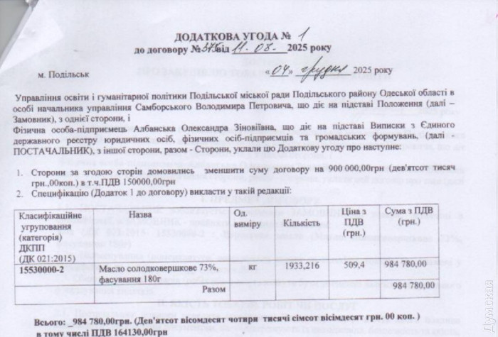 Как сыр в масле: жена мэра Подольска поставляет продукты для детей по спекулятивным ценамСотни тысяч гривен переплатила мэрия Подольска на закупке сливочного масла для образовательных учреждений. Победителем тендера стала жена мэра города Олега Албанского. Как следует из данных Prozorro, город решил купить партию сливочного масла 72,5-73% для детей от трех лет. Тендер провело 4 декабря управление образования и гуманитарной политики Подольского горсовета. Изначально чиновники хотели приобрести 3700 килограмм масла для лицеев, гимназии и детских садов города на сумму чуть более 2 млн гривен. Впрочем, вскоре после начала тендера сумма снизилась до 1,8 млн гривен. На предложение поучаствовать в тендере откликнулись два претендента. Тендер выиграла с минимальным разрывом в 2220 гривен фоп Александра Албанская, предложив прибрести у нее масло по цене 509,4 гривни за килограмм. В процессе проведения аукциона и уже после победы в нем фоп Албанская А.З., Подольское управление образования снизило объем закупки до 1933 кг, о чем свидетельствует дополнительное соглашение опубликованное в тендере Стоит упомянуть, что изначально в тендере упоминалась спецификация масла от заказчика – сливочное для детей от 3-х лет 73% ТМ Клуб сыра в упаковке 180 грамм. А также приемлемая цена для заказчика - 424,50 гривен. Масло этого бренда довольно дорогое, в интернете есть предложения его приобрести по цене 89.50 гривен за пачку, то есть по 497,2 гривен за килограмм. Впрочем, в процессе изменений тендера, точное название производителя продукта исчезло – в спецификации дополнительного соглашения договора нет ни слова о масле от бренда Клуб Сыра – вместо этого фигурирует лишь общее название «масло сладковершковое 73%, фасовка 180 грамм. Зато осталась цена — 509,4 гривни за килограмм. Итого фоп Албанская обязалась поставить Подольскому городскому управлению образования 1933 кг 73% масла по 509,4 гривни на сумму 984 тыс. с НДС. Цена на масло для деток Подольска явно завышена в разы – «Думская» нашла предложения приобрести этот продукт по цене намного дешевле — по 180 грамм по цене 59.80 гривен. То есть цена за килограмм 331,89 гривен. Есть предложения в этом же ценовом сегменте — цена пачки масла 180 грамм здесь дороже — по 68 гривен. То есть по 377,7 гривен за килограмм продукта. Мы решили посчитать разницу исходя от этого предложения. 377,7 умножаем на 1933,216 килограмм – это 730 тыс. гривен. Разница между этим числом, и суммой полученной по договору фоп Албанская — более 254 тыс. гривен. Неплохая прибыль от всего лишь одной сделки, если учитывать целевое направление продукции – дети Подольска, а также военное время. Стоит упомянуть, что фоп Албанская А.З. уже фигурирует в антикоррупционном расследовании , в котором отмечается, что жена мэра Подольска с момента его назначения главой города в 2022 году стала с завидной скоростью и частотой выигрывать почти все тендеры на продукты, объявляемые бюджетными учреждениями района и города. Также указано, что ФОП Албанская А.З. пользуется тем же телефоном, что и ее супруг, который помимо работы муниципальным чиновником, попутно владеет сетью продуктовых магазинов в Подольске. После карьерного роста мужа, его супруга Александра Албанская стала побеждать в тендерах в геометрической прогрессии. Например, в 2022 году Албанская выиграла тендеров на сумму 5, 7 млн грн., в 2023 год