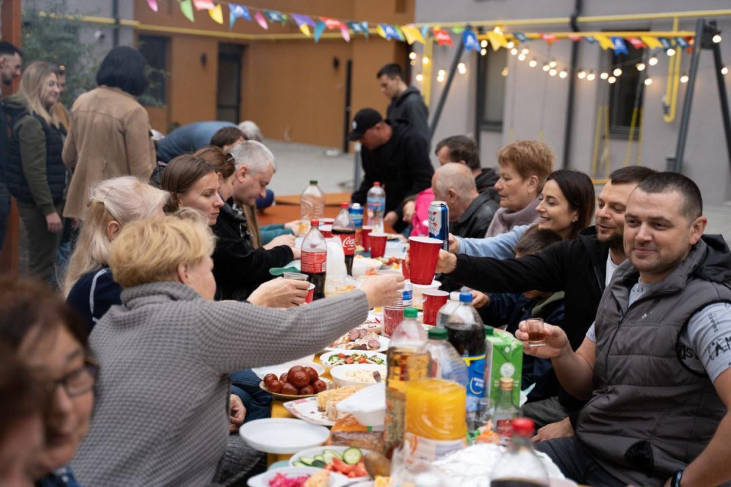 Під час того, як ми оглядали двір, почалася тривога. Марина запросила нас в укриття на цокольному поверсі. Керуюча компанія зробила все, щоб це місце було максимально комфортним — облаштовані місця для сидіння, встановлені баки з питною водою, аптечки та вільний доступ до Wi-Fi. Нам не довелося довго чекати — тривога закінчилася, тож ми продовжили екскурсію і вирушили у гості до Марини та інших мешканців. СПІЛЬНОТА ДРУЖНІХ СУСІДІВ «Ми всі дуже швидко познайомились, бо за час, що я тут, вже було організовано два великих свята. Я особисто швидко почала почуватися, як вдома. Бо всі тут вже ніби як свої», — поділилася враженнями Марина.