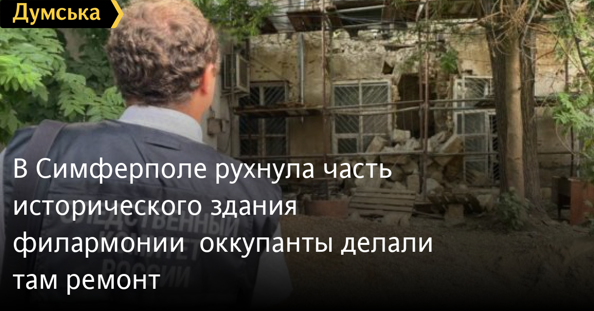В Симферполе рухнула часть исторического здания филармонии – оккупанты делали там ремонтВ центре Симферополя в аннексированном Крыму, на улице Пушкина, во время реконструкции обвалилось здание филармонии. Об этом сообщает «Комсомольская правда». Историческое сооружение обрушилось частично — разрушилась внутренняя перегородка и деревянное перекрытие между этажами, после чего упала часть стены на втором этаже. Общая площадь обвала достигла примерно 35 кв. метров. По предварительным данным, никто не пострадал. Отрезок улицы Пушкина перекрыли, спасатели оградили квартал. Отметим, что в июне этого года в филармонии стартовала реконструкция, которая должна продлиться до 31 августа 2023 года. На работы намерены были потратить около 82 миллионов российских рублей. Предположительно, во время ремонта несущая стена и обвалилась, так как была повреждена. Рабочих во время инцидента не было на месте. Отметим, что Крымская филармония была построена в 1939-м году. Это одно из старейших учреждений культуры на полуострове. СМЕРТЬ РОССИЙСКИМ ОККУПАНТАМ! Заметили ошибку? Выделяйте слова с ошибкой и нажимайте control-enter |