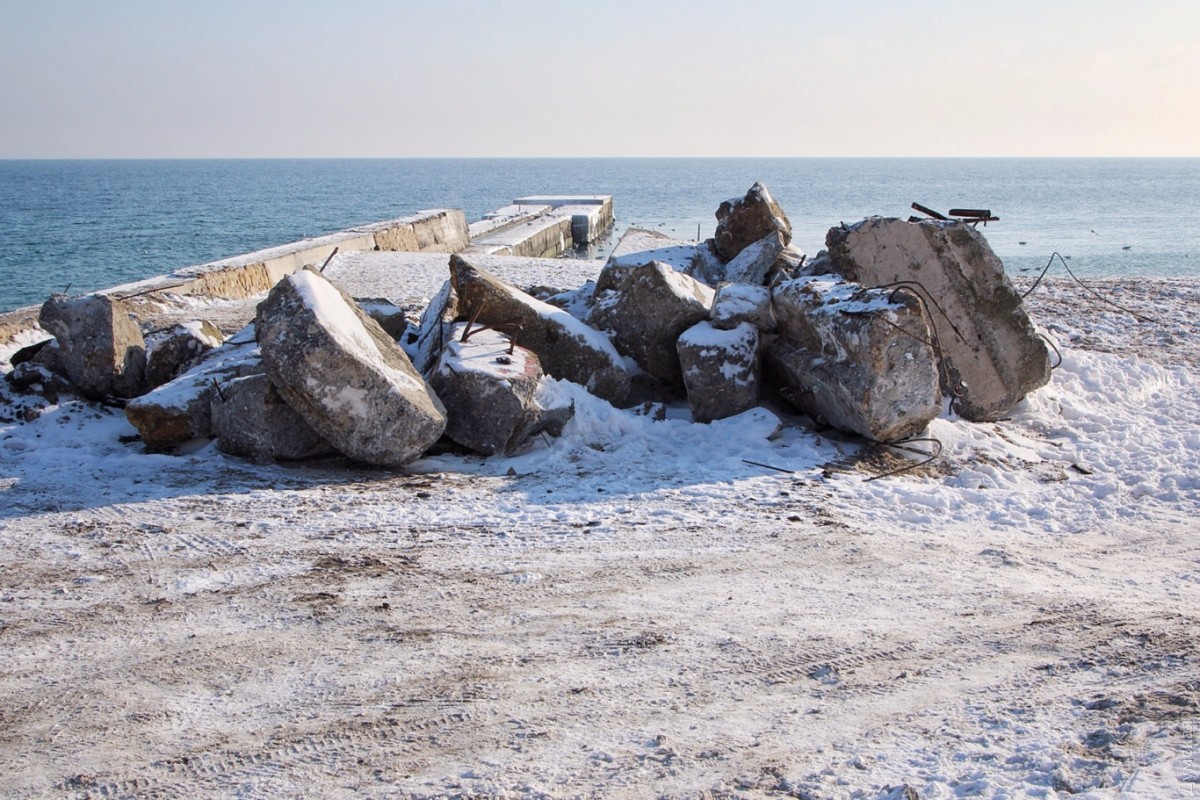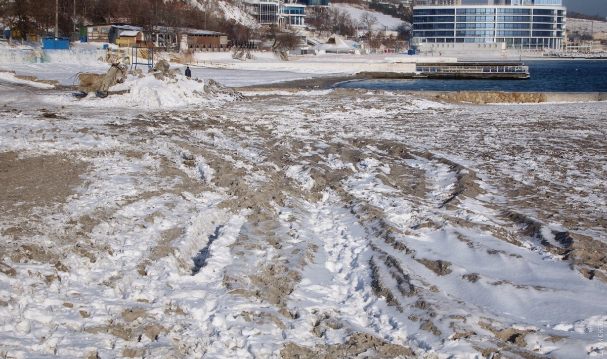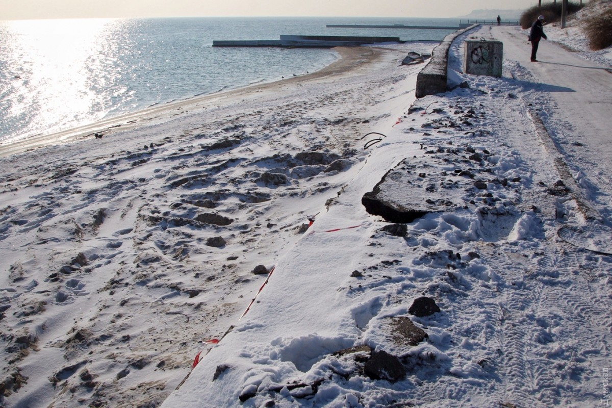 Как стало известно редакции «Думской», в районе 11-й станции Большого Фонтана начато строительство второй торговой площадки дельца. Здесь снесли бетонное ограждение на подпорной стенке, а на песке — следы от строительной техники. Судя по всему, работам помешал внезапный снегопад, обрушившийся на город. Застройщики временно бросили бетонные куски ограждения прямо на пляже.