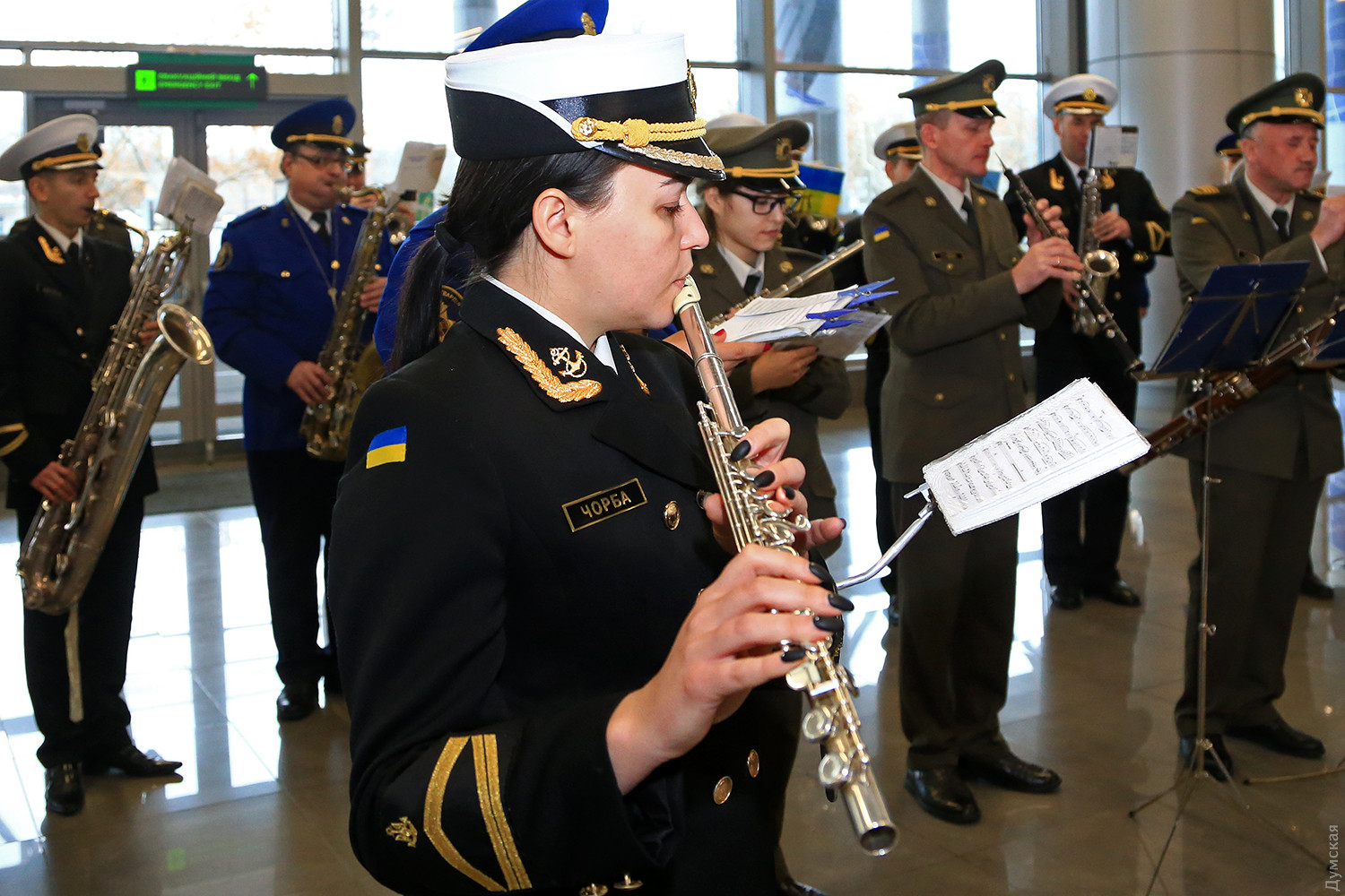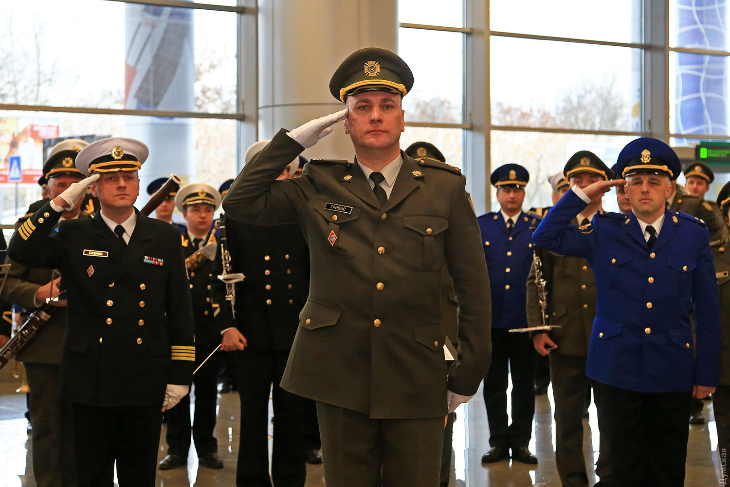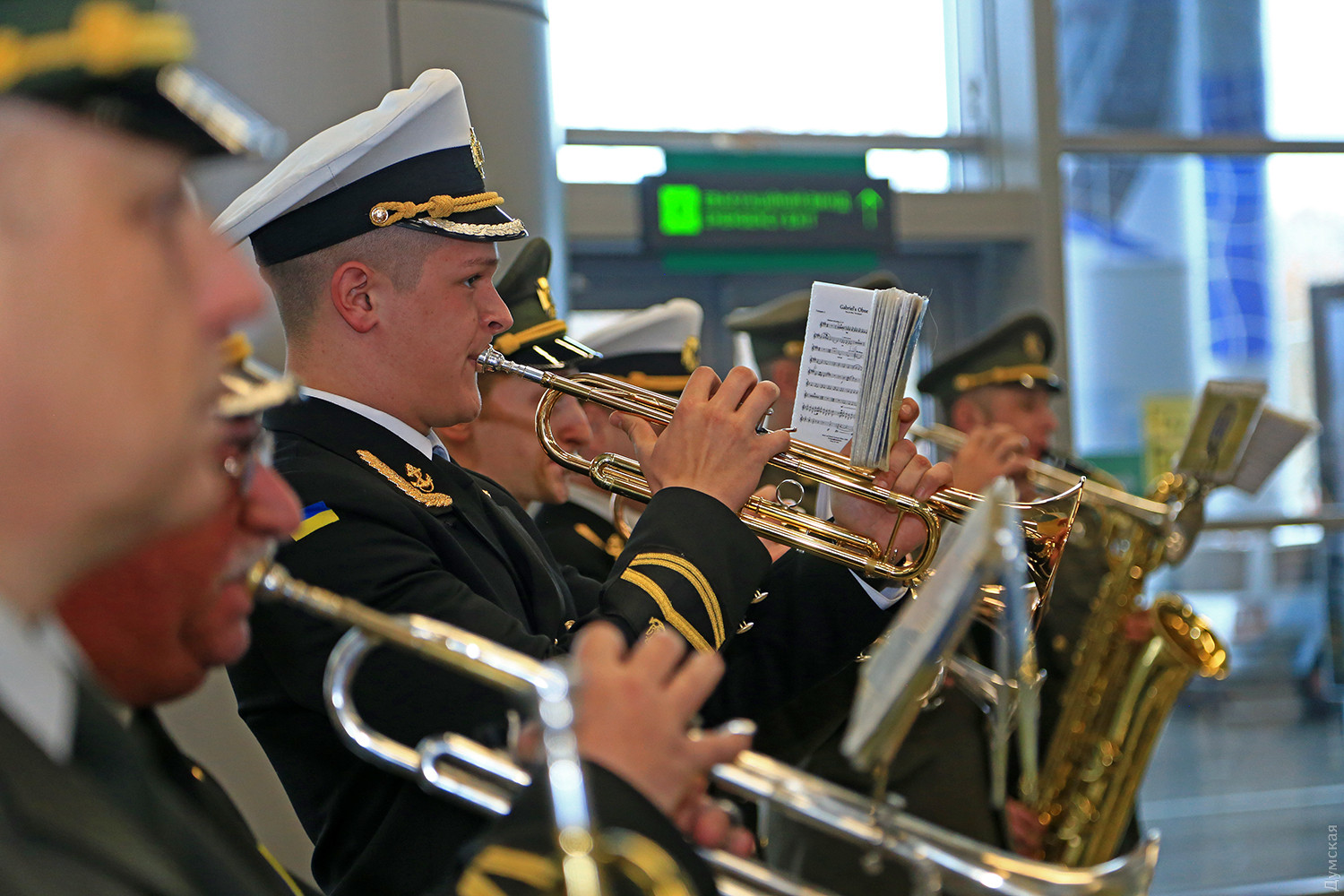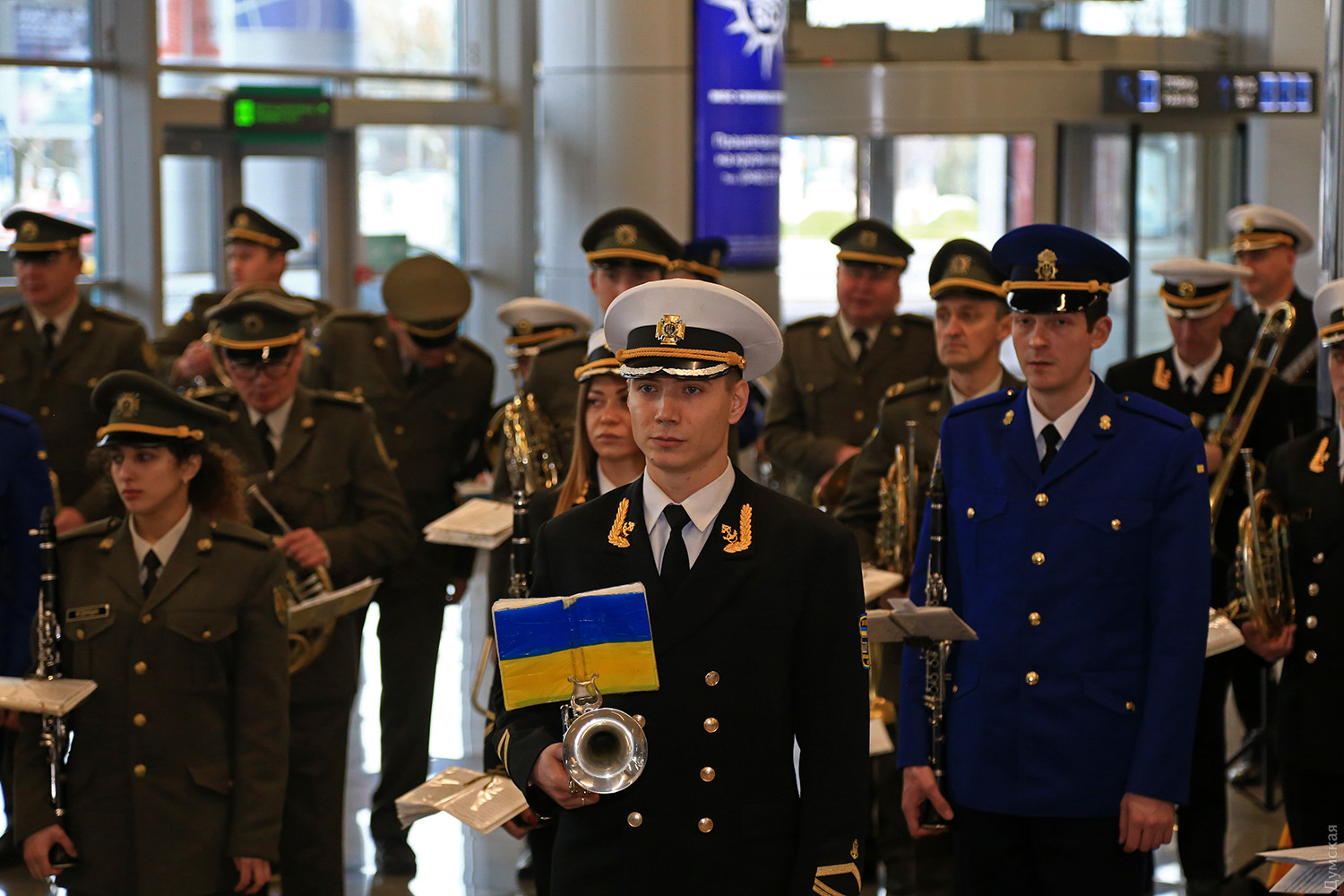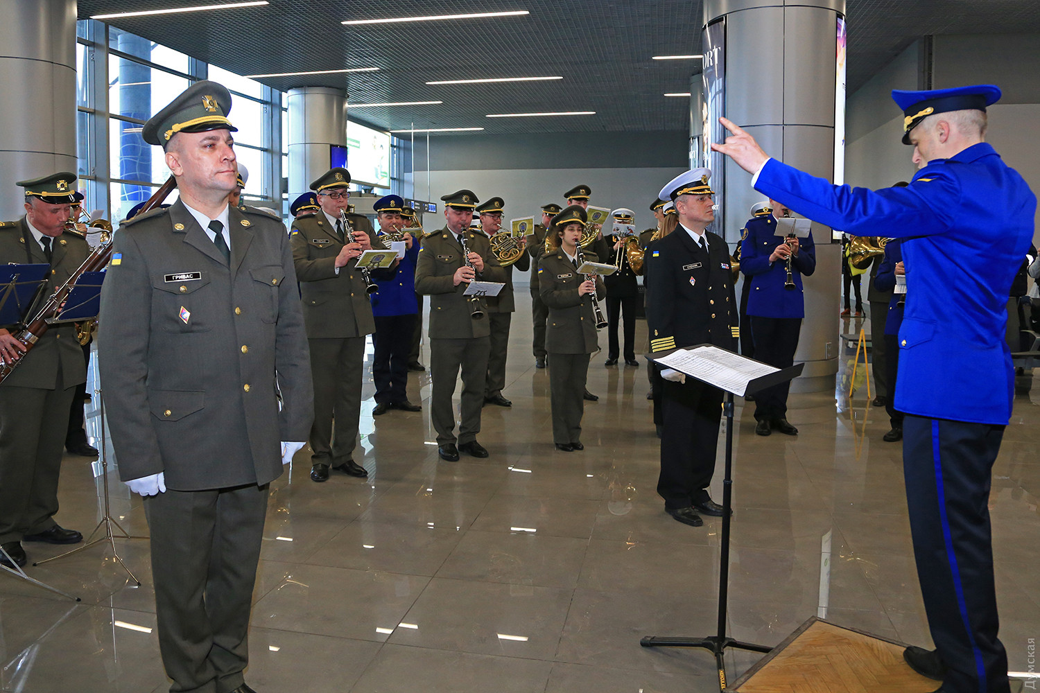 Сегодня днем в новом терминале Одесского международного аэропорта прошел небольшой концерт, посвященный памяти «киборгов» — военных и добровольцев, которые погибли при защите Донецкого аэропорта. Тройка одесских военных оркестров — ВМСУ, одесской Военной академии и оркестр в/ч 3012 Нацгвардии сыграли пять композиций в зале прилета. Около пятидесяти военных музыкантов в одном строю исполнили несколько композиций, в том числе фрагмент Симфонии №7 Бетховена, «Танец рыцарей» из балета Прокофьева «Ромео и Джульетта» и «Адажио» Альбинони. «Хотя мы много репетировали, но не так просто было сегодня стоять перед оркестром. В этих произведениях заложен большой смысл, и во время исполнения я ощущал духовную связь с защитниками Донецкого аэропорта», — отметил дирижер оркестра Нацгвардии майор Александр Федорчук. В зале прилета зрителей оказалось не очень много, но по окончании все они тепло приветствовали музыкантов. Отметим, героическая оборона аэропорта длилась 242 дня. Только по официальным данным при защите объекта погибло более двухсот украинских бойцов. Фото Сергея Смоленцева СМЕРТЬ РОСІЙСЬКИМ ОКУПАНТАМ! Помітили помилку? Виділяйте слова з помилкою та натискайте control-enter |