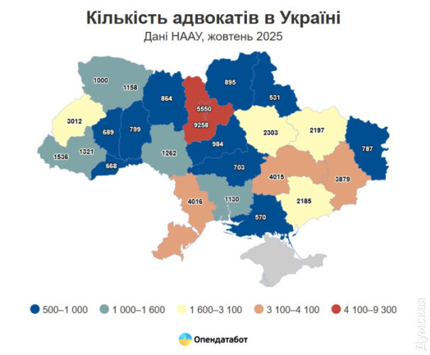 Всего в Украине работает 52 960 правозащитников. Это на 401 меньше, чем летом, когда Национальная ассоциация адвокатов приводила цифру 53 361 действующего специалиста. В то же время с начала полномасштабного вторжения их количество выросло на 8%.