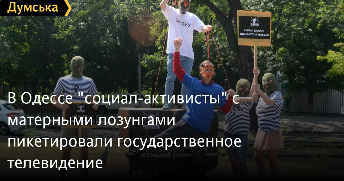 В Одессе «социал-активисты» с матерными лозунгами пикетировали государственное телевидениеОбщественная организация «Искра» провела в Одессе акцию «в поддержку честных журналистов». Арт-протест, как его назвали сами организаторы, провели под зданием Одесской областной государственной телерадиокомпании, которую с 2007 года возглавляет Оксана Матюх, которую называют человеком нардепа-«регионала» Леонида Климова. По информации СМИ, политика руководителя вызывает недовольство трудового коллектива. «Искра» провела очередной арт-протест в поддержку честных журналистов и осуждению олигархов, которые оказывают давление на средства массовой информации с целью своей выгоды, тем самым освещая новости не с правдивой стороны», — говорится в сообщении организаторов акции (орфография и пунктуация оригинала сохранены). Группа активистов в масках пришла к зданию ГосТВ с транспарантами, которые содержали нецензурную лексику. Там же участники акции разыграли сценку об олигархе и его марионетках-журналистах, которых освобождают и дают возможность свободно работать. «Мерзко, когда на журналистов оказывают давление в своих корыстных целях и освещение тех или иных событий в стране, или в городе, в частности, представлено с противоположной стороны, чем было проведено или вовсе не освещено», — отмечается в сообщении. СМЕРТЬ РОССИЙСКИМ ОККУПАНТАМ! Заметили ошибку? Выделяйте слова с ошибкой и нажимайте control-enter |