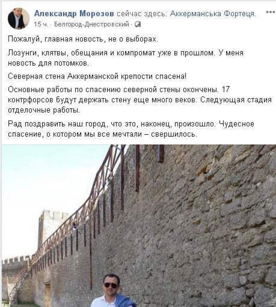 Аккерманская крепость: укрепление северной стены так и не завершили, но дирекция рапортует о спасении объектаНесколько дней назад директор коммунального предприятия «Фортеця», в ведении которого находится Аккерманская крепость, опубликовал на своей странице в Facebook «пост для потомков», в котором сообщил, что «северная стена Аккерманской крепости спасена», и поздравил всех причастных к этому знаменательному событию. По словам Александра Морозова, «осталось провести лишь отделочные работы». Мы решили проверить, так ли это, и с удивлением обнаружили, что руководитель соврал. До завершения там далеко: подрядчик не закончил даже бетонные контрфорсы, которые должны защитить стену от обрушения. Арматура поросла травой и давно поржавела, два бура валяются, деревья, выросшие на месте работ, уже вымахали выше человеческого роста. Напомним, защитное сооружение, на которое из бюджета области потратили почти 8 млн грн, должны были открыть еще в мае 2017-го года, однако этого не произошло до сих пор. СМЕРТЬ РОСІЙСЬКИМ ОКУПАНТАМ! Помітили помилку? Виділяйте слова з помилкою та натискайте control-enter Новини по цій темі: 17 серпня 2025: Продають мерч у залі Костанді, ховають Стародавній Єгипет у підвалах і виставляються в Німеччині: як виживають одеські музеї (частина перша) 24 березня 2025: Деградація 411-ї: чому занепав меморіал оборони Одеси і куди діваються гроші від комерції на ньому? 21 лютого 2025: Одеського Караваджо запрошують до Риму, але картина все ще під арештом: коли його знімуть? 6 лютого 2025: Врятувати вітражі Філармонії: в Одесі реставратори та волонтери збирають осколки історії (фото) 1 лютого 2025: Одеський музей «вже не тільки Пушкіна» серйозно постраждав від російського обстрілу: реорганізація відкладається на невизначений термін |