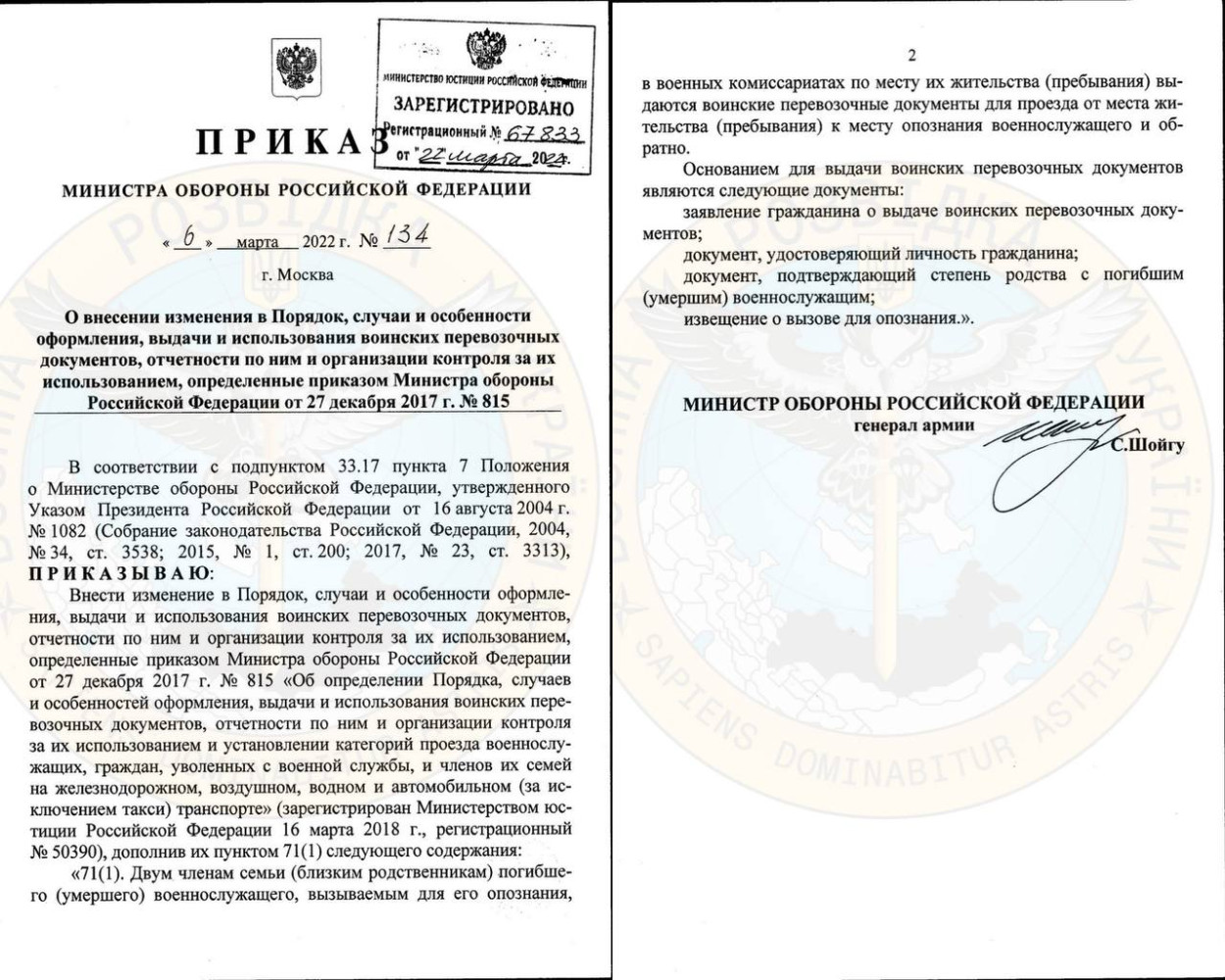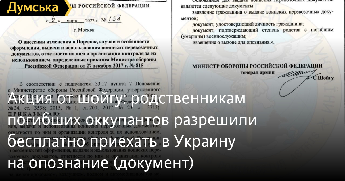 Акция от шойгу: родственникам погибших оккупантов разрешили бесплатно приехать в Украину на опознание (документ)Родственникам погибших на войне против Украины российских солдат предлагают бесплатно прокатиться в нашу страну и обратно в рф на опознание тела. Как сообщает Главное управление разведки Минобороны Украины, соответствующий приказ подписал министр обороны нацистской россии сергей шойгу. «Акция от шойгу для родственников уничтоженных оккупантов: бесплатный тур на опознание, — сообщают в ГУР. — Очевидно, по мнению российского командования, эта льгота должна повысить лояльность россиян к войне на территории Украины. Особенно, учитывая тотальную задержку обещанных выплат российским военнослужащим и членам их семей». Напомним, по данным Генштаба Вооруженных сил Украины, в Украине ликвидированы ориентировочно 20 тыс. 900 вторгшихся в нашу страну оккупантов. СМЕРТЬ РОССИЙСКИМ ОККУПАНТАМ! Заметили ошибку? Выделяйте слова с ошибкой и нажимайте control-enter |