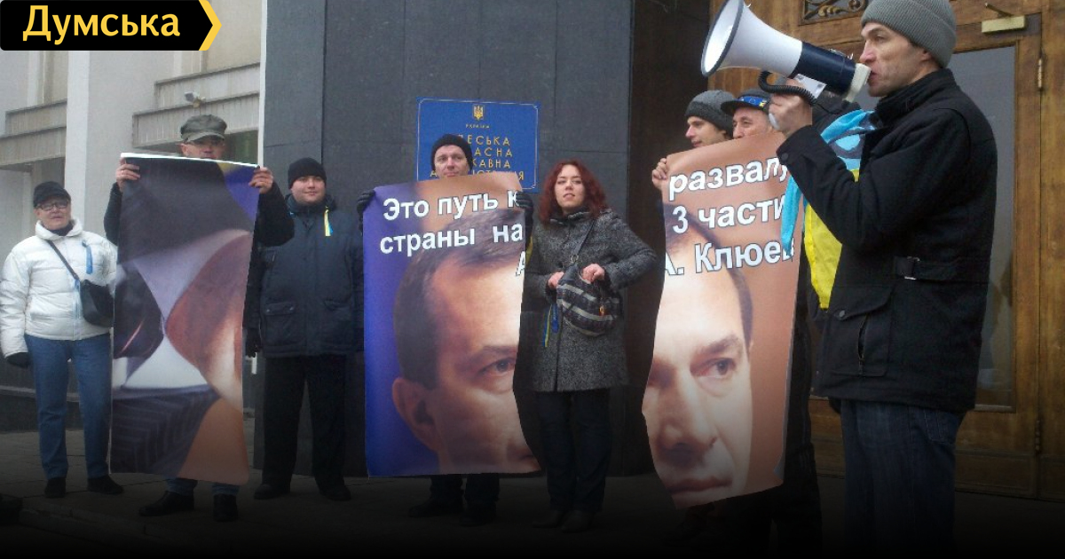 «Нас постоянно пытаются разделить то по языковому признаку, то по отношению к НАТО, то по геополитическому выбору между ЕС и ТС Он хотел разорвать страну — пусть получит то, что хотел» — заявили участники акции и разорвали на три части плакат с портретом главы СНБОУ Андрея Клюева и приписываемой ему фразой о начале раскола страны на три части.