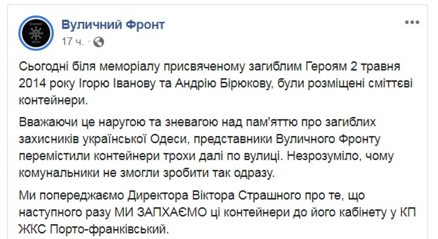 Активисты возмущены установкой мусорных контейнеров возле мемориала жертвам 2 мая на ПреображенскойАктивисты убрали мусорные контейнеры, установленные на углу Дерибасовской и Преображенской улиц, возле места гибели первых жертв столкновений 2 мая 2014 года — проукраинских активистов Игоря Иванова и Андрея Бирюкова. В организации «Уличный фронт» заявили, что расценивают такие действия коммунальщиков как надругательство над памятью погибших, и пообещали в случае повторной установки притащить контейнеры в ЖКС «Порто-Франковский». СМЕРТЬ РОСІЙСЬКИМ ОКУПАНТАМ! Помітили помилку? Виділяйте слова з помилкою та натискайте control-enter