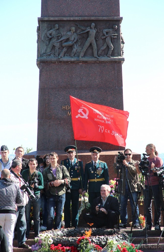 Кстати, кроме государственных флагов и городской символики, присутствововали и копии Знамени Победы.