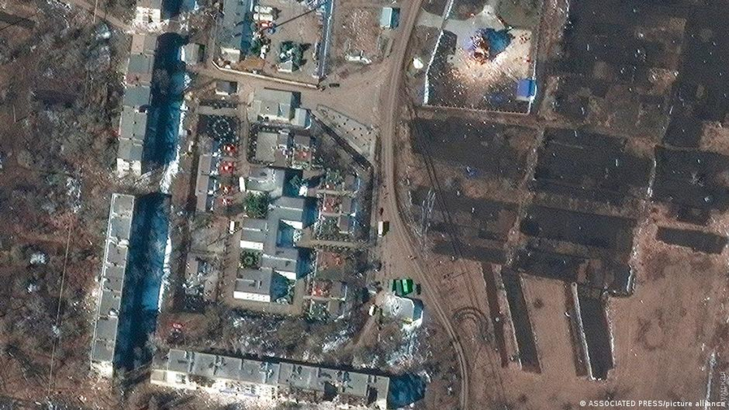 Взрывной волной повреждены несколько заведений, которые в зимний сезон были закрыты. По территории разбросаны обломки дрона, образовалась крупная воронка очевидцы подходят и осматривают место происшествия.