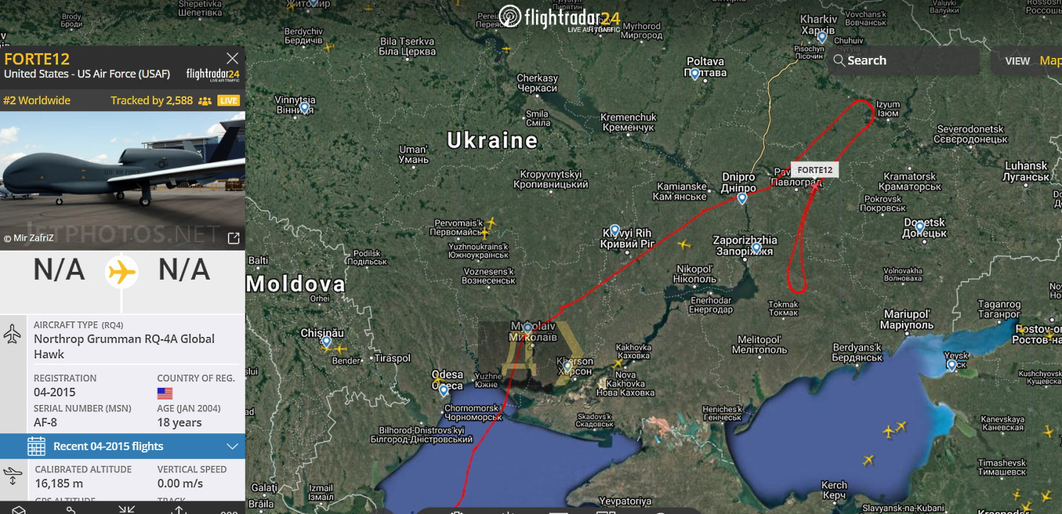 Сейчас беспилотник контролирует ситуацию в районе фронта на Донбассе, но можно предположить, что разведка продолжится вдоль северной границы с РФ и Беларусью.
