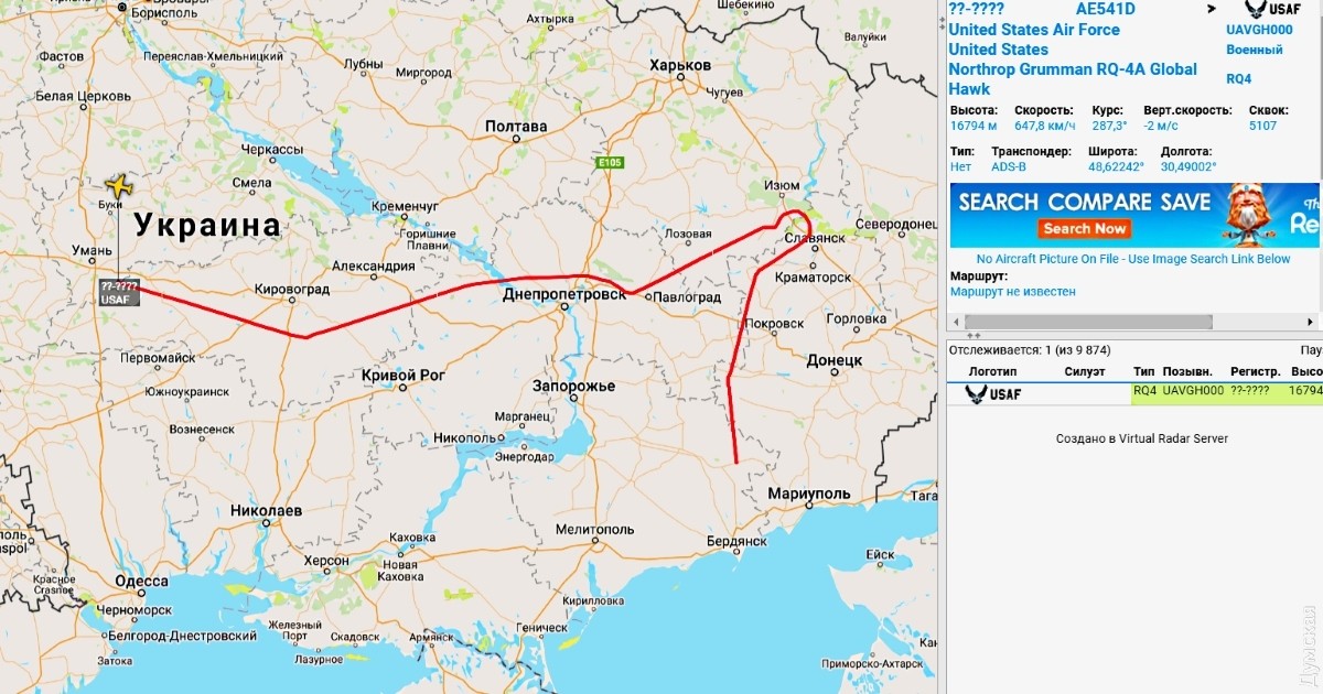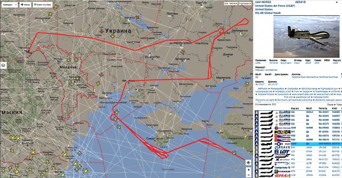 Американский разведчик RQ-4 пролетел от Крыма до Славянска и ускользнул от российского истребителя16 июля американский беспилотный стратегический разведчик RQ-4 Global Hawk проинспектировал линию нашего противостояния с агрессором — от южного берега Крыма через Очаков и Мариуполь до Славянска. Миссия стартовала около 8 часов утра с итальянской военной базы Сигонелла, что на острове Сицилия. Несмотря на то, что разведчик проводил сканирование территории на достаточном расстоянии, на его перехват подняли истребитель Су-27. Подойдя с запада к Крыму, он был обнаружен радиолокационными станциями страны-агрессора. Примерно в 10:36 с авиабазы Бельбек поднялся перехватчик Су-27СМ. Летчик «сушки» обнаружил американский беспилотник, но тот постоянно менял курс и высоту, поэтому путинский «сокол» много раз терял визуальный контакт. Игра в кошки-мышки продолжалась около 2,5 часов, после чего «Глобал Хоук» ушел через Николаевскую и Херсонскую область к Мариуполю, а затем повернул в северном направлении и прошел вдоль линии боевых действий на Донбассе. Полет RQ-4 проходил на высоте около 17 километров, со скоростью 600-700 км в час. Долетев до Славянска, «Хоук» развернулся на запад, прошел над Днепром и Уманью и в 21:10 пересек границу Украины с Румынией в районе города Черновцы. Полет разведчика продолжался в общей сложности более 16 часов. СМЕРТЬ РОСІЙСЬКИМ ОКУПАНТАМ! Помітили помилку? Виділяйте слова з помилкою та натискайте control-enter |