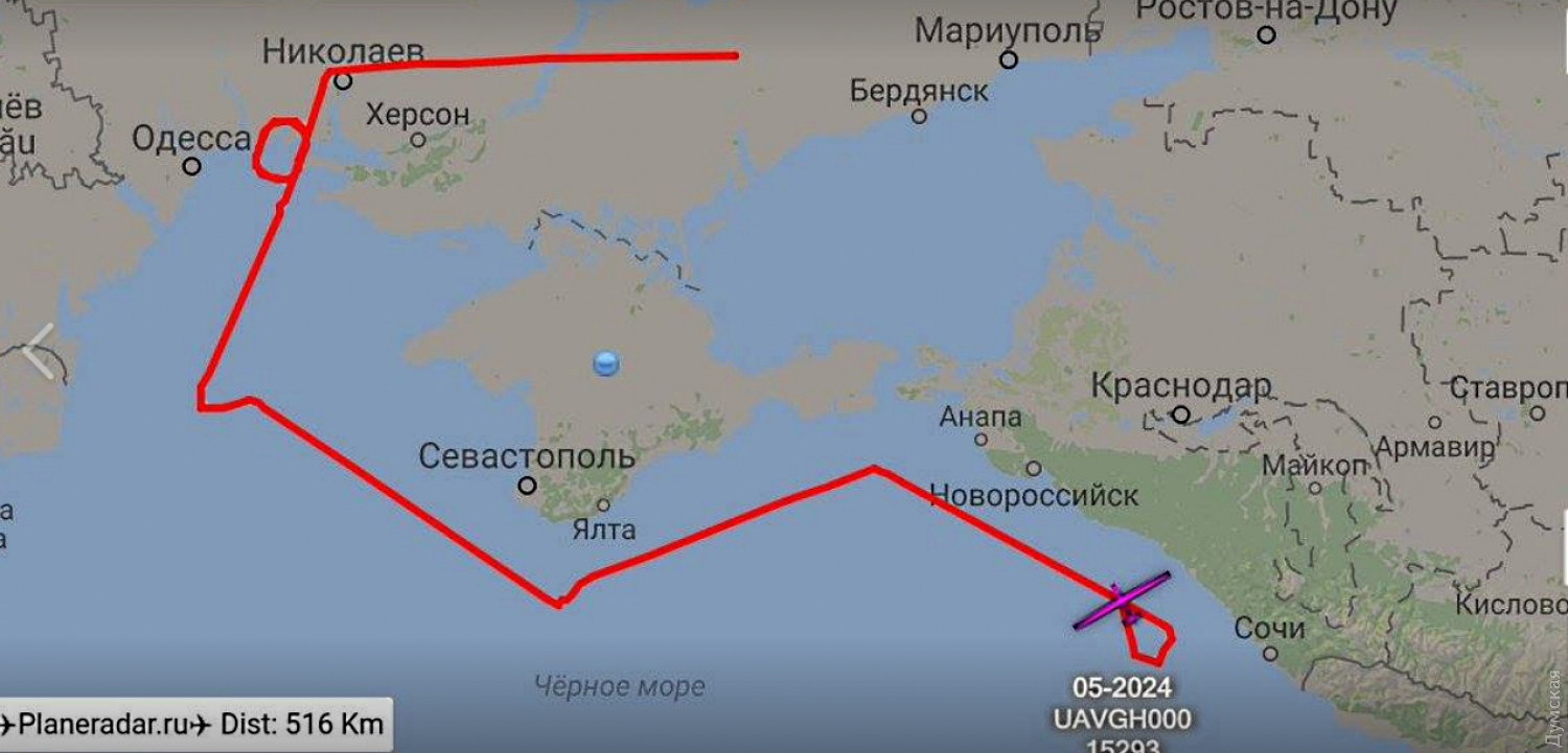 Интересно, что, проходя Очаков, беспилотник сделал круг над портом и строящейся там американской базой. Далее, огибая оккупированный Крымский полуостров, вышел к Новороссийску, а завершил миссию в окрестностях Сочи, после чего вернулся на Сицилию.