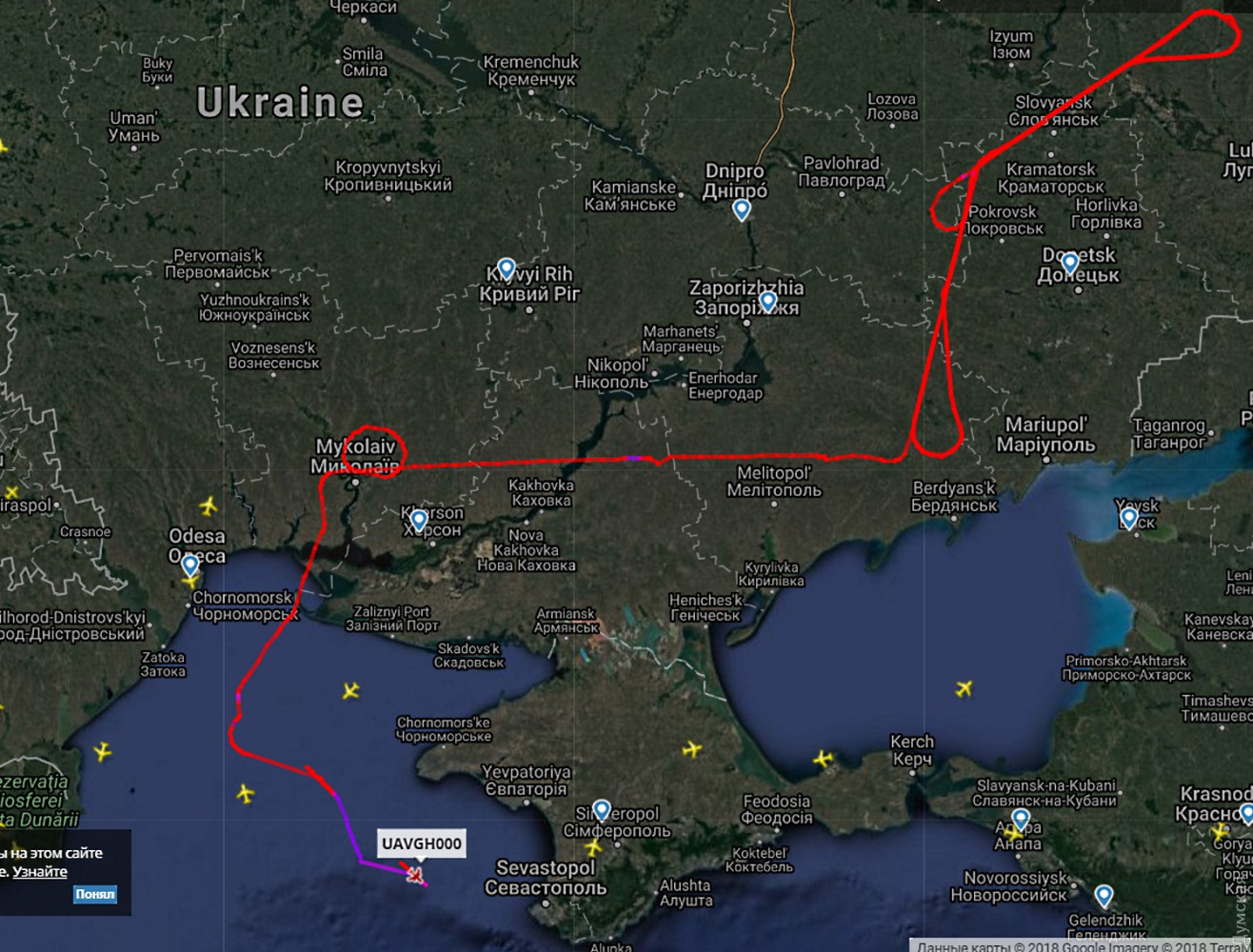 Далее, пройдя над Николаевом, он начал облет побережья Крыма. Полет проходит на высоте более 17 тысяч метров.