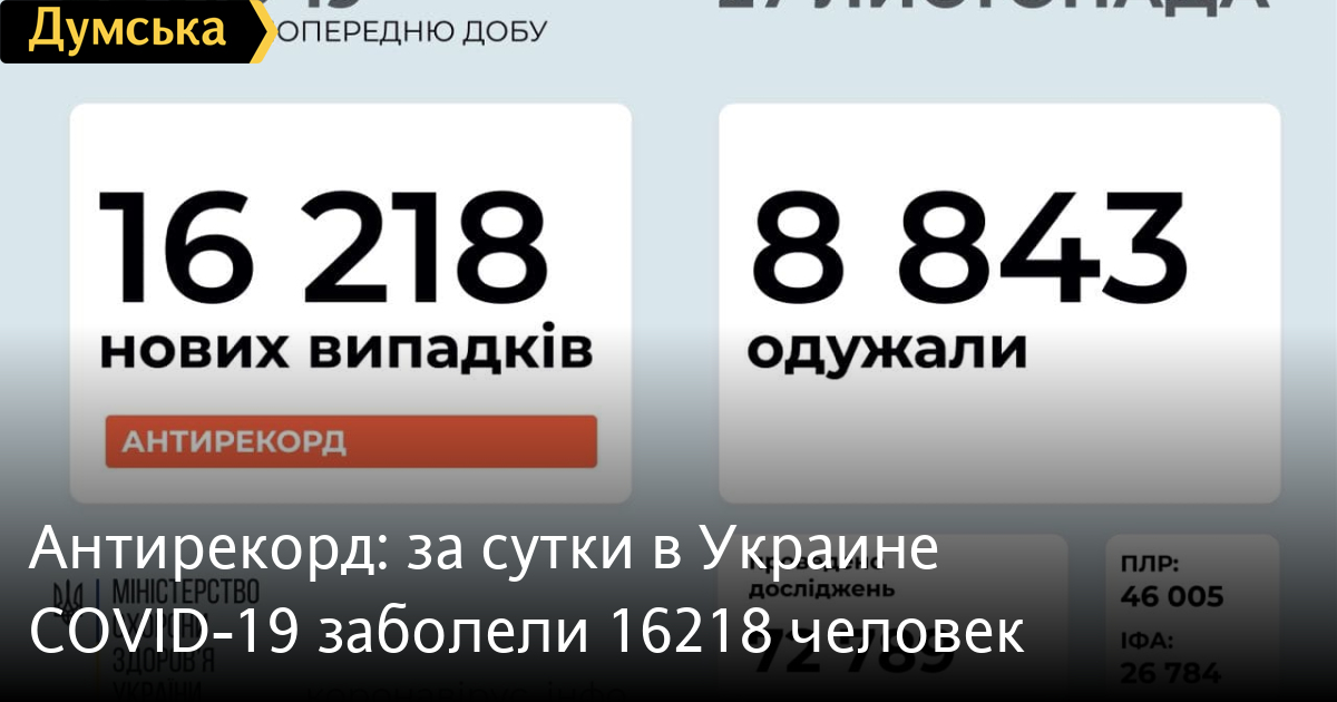 Новый антирекорд по скорости распространения COVID-19 в Украине – 26 ноября заразились 16218 человек. Общее число инфицированных выросло до 693407. Больше всего заболевших вчера было в Днепропетровской области – 1773, Киеве – 1520 и Запорожской области – 1003. В Министерстве здравоохранения сообщили, что вчера от осложнений COVID-19 скончались 192 пациента. Всего с начала пандемии умерли 11909 заболевших. Самая высокая летальность вчера была в Днепропетровской области – 29 умерших, в Киеве умерли 26 пациентов с «ковидом», в Киевской области – 15. За прошедшие сутки выздоровели 8843 человека (326238 за все время). Больше всего в Харьковской области – 1356 и в Днепропетровской области – 1164. Новые подозрения на «ковид» получили 17552 человека (780991). Лидируют также Киев, Днепропетровская и Запорожская области. СМЕРТЬ РОССИЙСКИМ ОККУПАНТАМ! Заметили ошибку? Выделяйте слова с ошибкой и нажимайте control-enter |