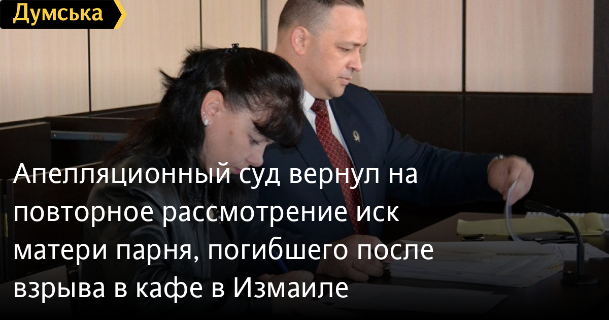 Апелляционный суд вернул на повторное рассмотрение иск матери парня, погибшего после взрыва в кафе в ИзмаилеВ четверг, 13 декабря, в апелляционном суде Одесской области слушалось дело Ирины Молчановой, матери Александра Маламена, который 11 января 2015 года получил смертельные травмы во время взрыва в измаильском кафе «У фонтана». Интересы потерпевшей в суде представляет адвокат Евгений Живора. Как пояснил правозащитник, апелляционный суд отменил приговор Измаильского горрайонного суда, который решил оставить гражданский иск без рассмотрения, и направил дело в суд первой инстанции для нового судебного разбирательства — повторного решения вопроса о возмещении морального и материального вреда потерпевшей. Что касается владельца кафе «У фонтана» Олега Дойчева, то он, по словам Евгения Живоры, по-прежнему не признает себя обязанным компенсировать матери погибшего парня расходы на лечение, памятник и недополученную зарплату. Напомним, 12 июля нынешнего года Измаильский горрайонный суд признал Олега Дойчева виновным по ч. 2 ст. 270 (нарушение установленных законодательством требований пожарной безопасности, повлекшее гибель людей, имущественный ущерб в особо крупном размере или иные тяжкие последствия) УК Украины и приговорил его к пяти годам лишения свободы. Однако в соответствии с Законом Украины «Об амнистии в 2016 году» он был освобожден от наказания. Гражданский же иск потерпевшей Ирины Молчановой, в котором она потребовала от Дойчева компенсацию морального ущерба свыше 400 тыс грн и 1 млн 965 тыс грн материального ущерба, был оставлен судьей Юрием Волковым без рассмотрения в связи с отсутствием надлежащей доказательной базы. Ирина Молчанова подала апелляцию.
