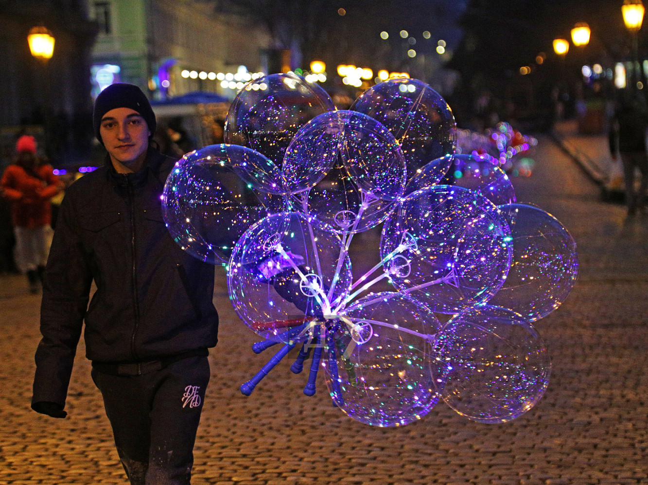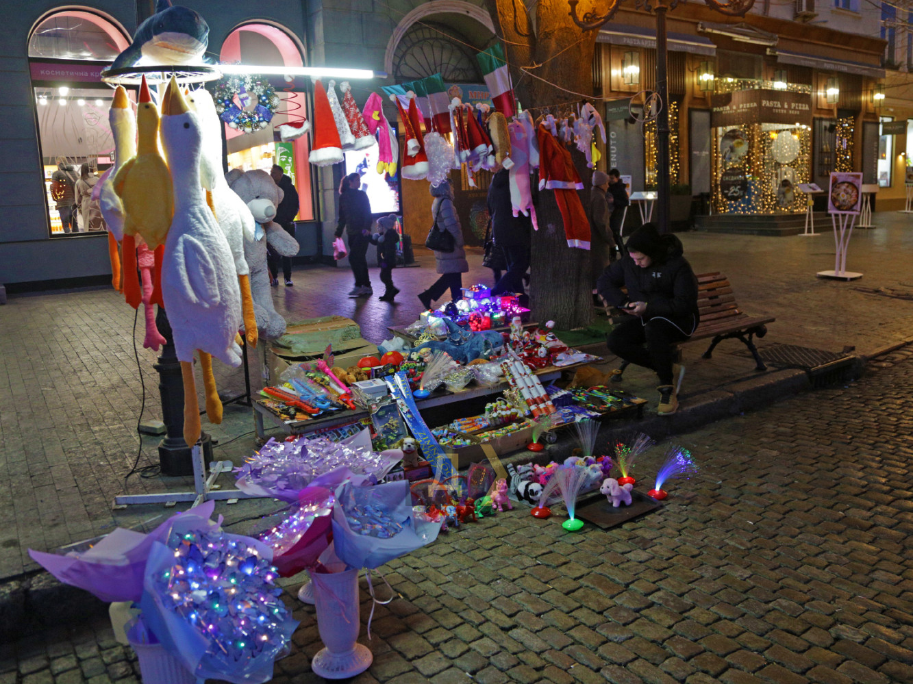 Предпраздничная суета для одесситов, как и для жителей других регионов Украины, уже второй год проходит под вой сирен и звуки обстрелов. Сегодня, 30 декабря, в городе приспущены флаги, но на Дерибасовской всегда праздник — кришнаиты танцуют свои зачаровывающие танцы, пони катают детей, кто-то кормит домашних кроликов. А на посиневшего от холода Давида, который стоит у входа в один из ресторанов центра Одессы, надели праздничный колпак. Торговые лавки предлагают подарки на любой вкус, а полки магазинов ломятся от алкоголя и закусок. Новогодние базары полны елок, продавцы говорят, что спрос невелик, поэтому цены немного упали. Ровно треть зимы позади, завтра — Новый год! Фото Сергея Смоленцева СМЕРТЬ РОССИЙСКИМ ОККУПАНТАМ! Заметили ошибку? Выделяйте слова с ошибкой и нажимайте control-enter |