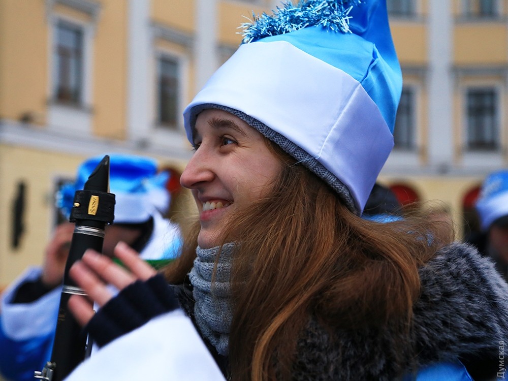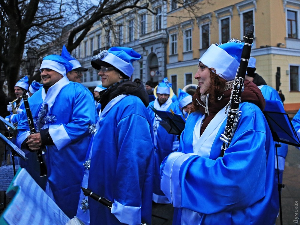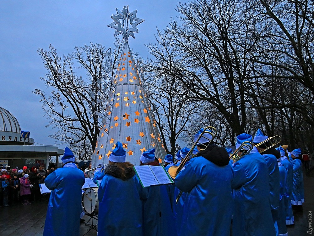 Как передает корреспондент «Думской», десятиметровое «дерево» выросло прямо напротив входа в фуникулер. Открытию аккомпанировал оркестр рождественских дедов, облаченных во все голубое.