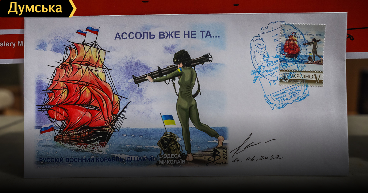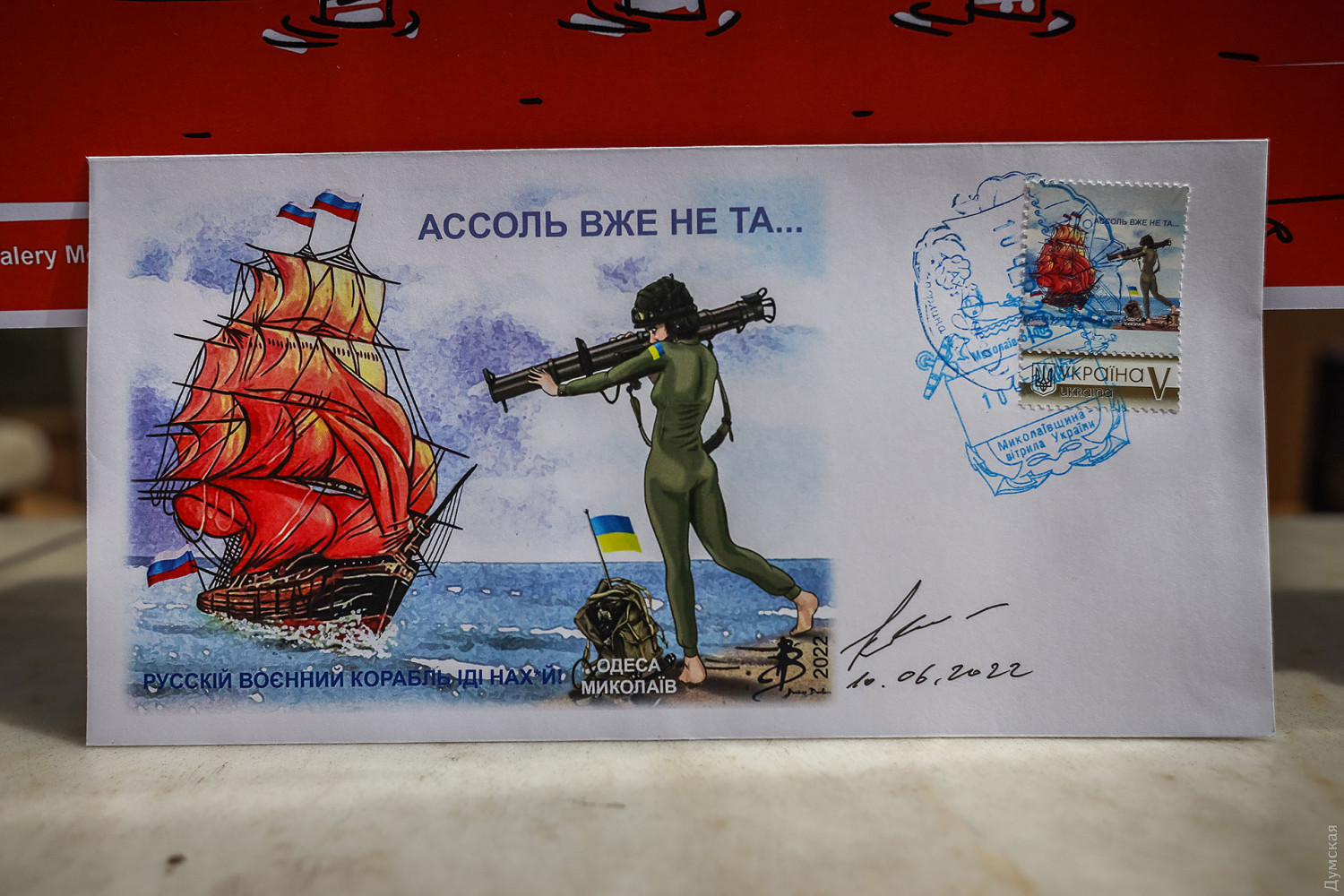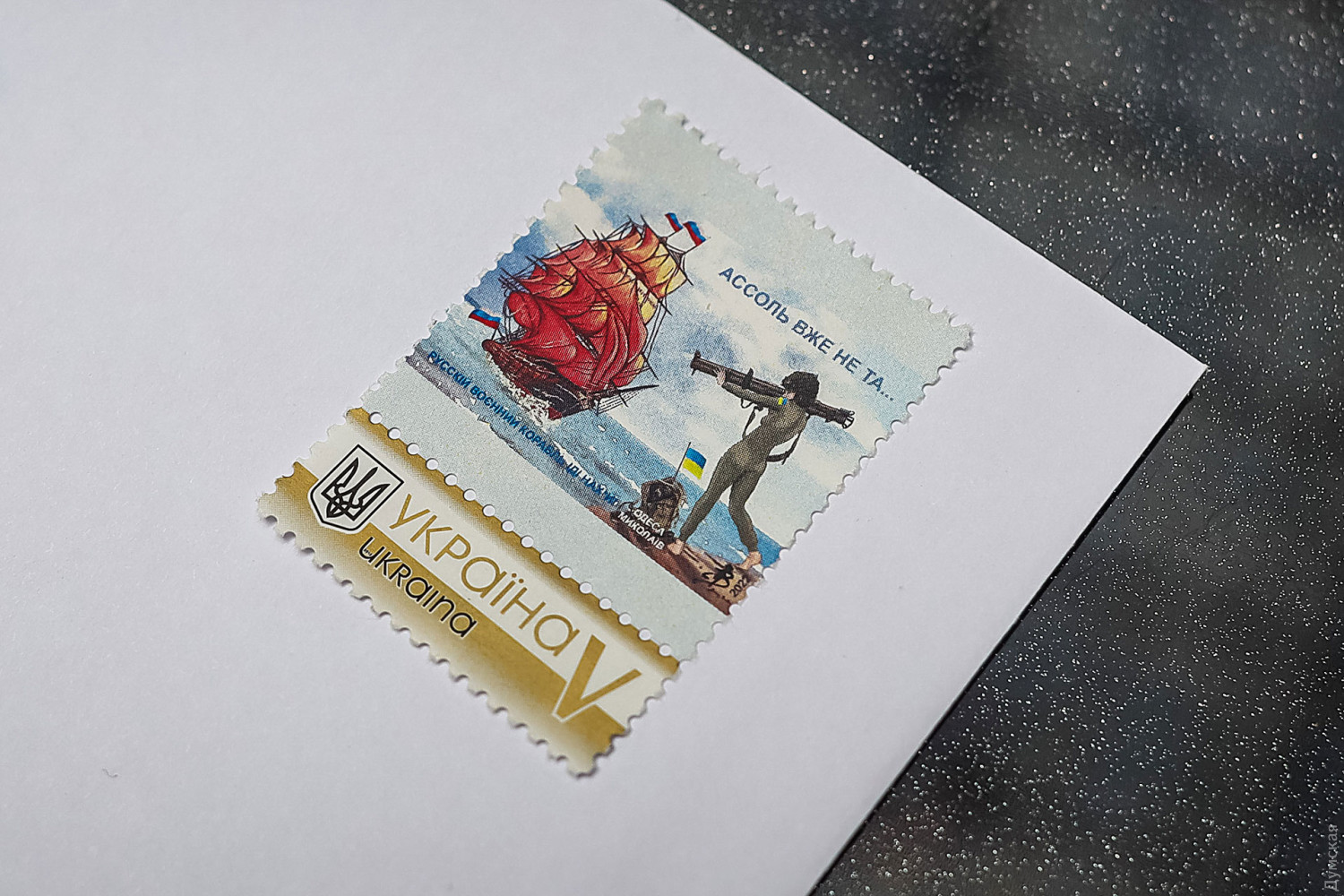 На марке «Ассоль уже не та» изображена работа одесского художника Виктора Джеваги, участника международной выставки карикатур «Русский военный корабль иди…», передает корреспондент «Думской».