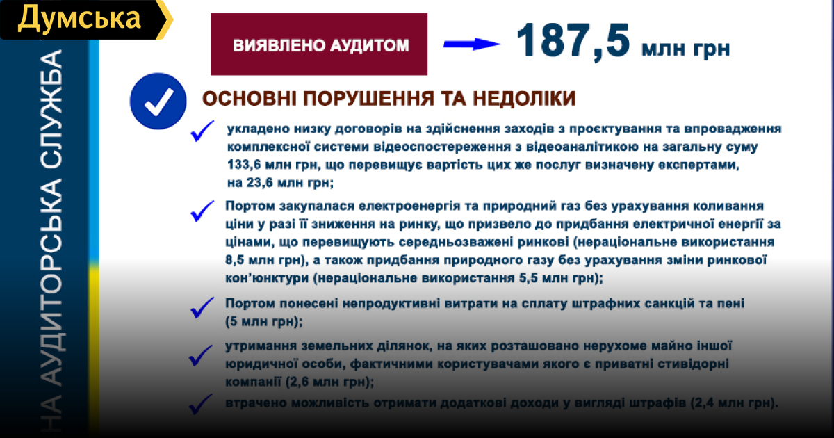 Финансовый аудит деятельности государственного предприятия «Морской торговый порт «Южный» в период с октября 2017 по август 2020 года провели сотрудники регионального подразделения Госаудитслужбы. Как сообщили в ведомстве, ревизоры выявили непродуктивные расходы на сумму 185 млн гривен и упущенную выгоду в размере 2,5 млн гривен. В частности, бывшее руководство порта заказало за 133,6 млн гривен комплексную систему видеонаблюдения, стоимость которой, по оценкам экспертов, завышена на 23,6 млн гривен. Кроме того, порт закупал по завышенным ценам электроэнергию и природный газ, а также понес многомиллионные расходы на оплату штрафных санкций и пени, которых можно было избежать. Также деньги тратили на содержание земельных участков, где расположена недвижимость частных стивидоров. Параллельно с аудитом в порту провели ревизию на предмет законности выплат зарплат и премий. Оказалось, что бывшему и.о. директора порта насчитали лишнюю зарплату на сумму почти 1,8 млн гривен и премию. Аудиторы направили руководству порта свои предложения и рекомендации по устранению выявленных нарушений и требование привлечь виновных к ответственности. Материалы ревизии передали в следственное управление ГУНП в Одесской области. Результаты аудита направили в ГБР. СМЕРТЬ РОСІЙСЬКИМ ОКУПАНТАМ! Помітили помилку? Виділяйте слова з помилкою та натискайте control-enter |