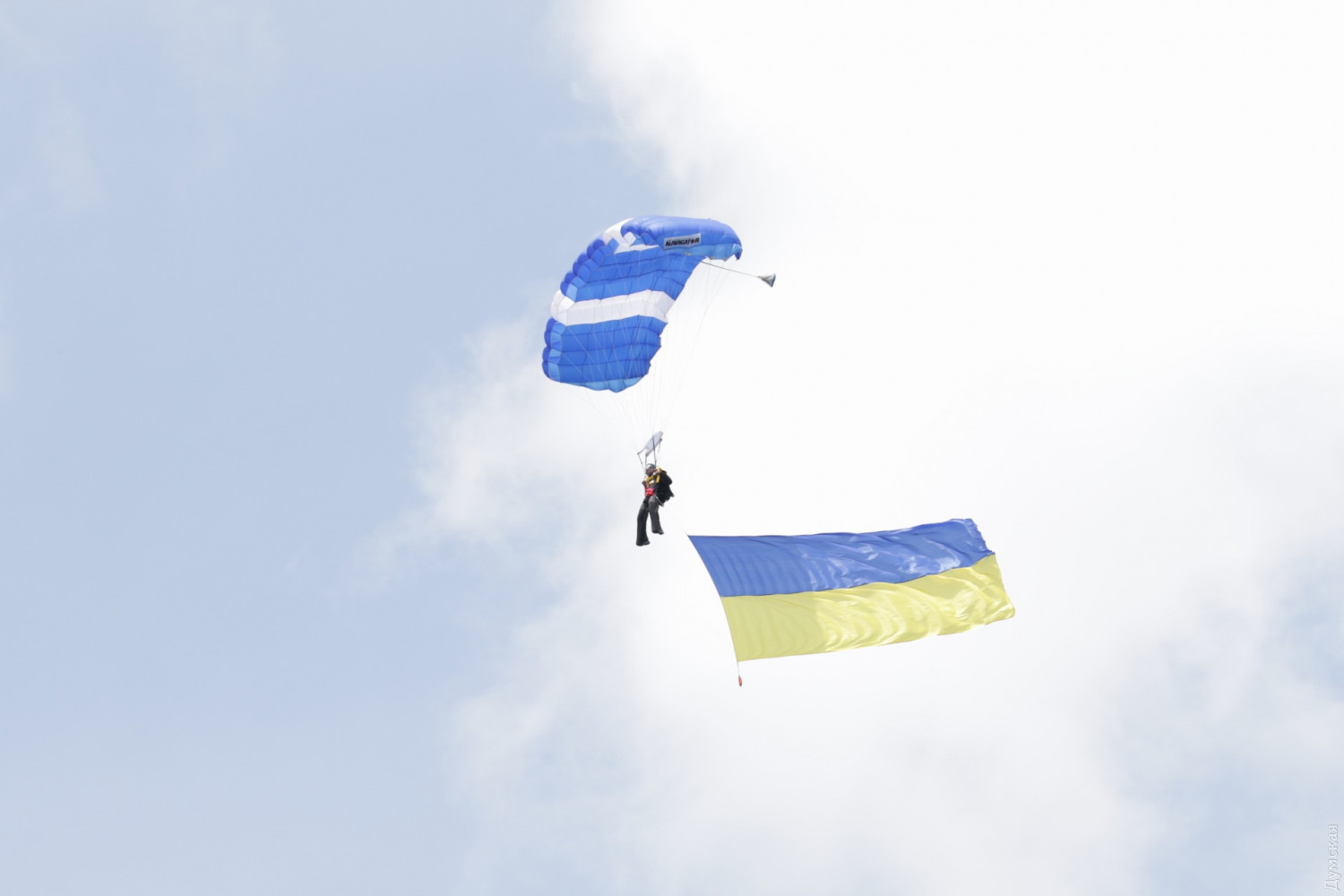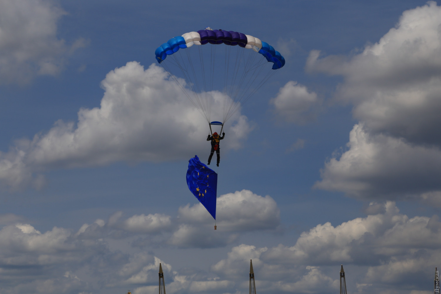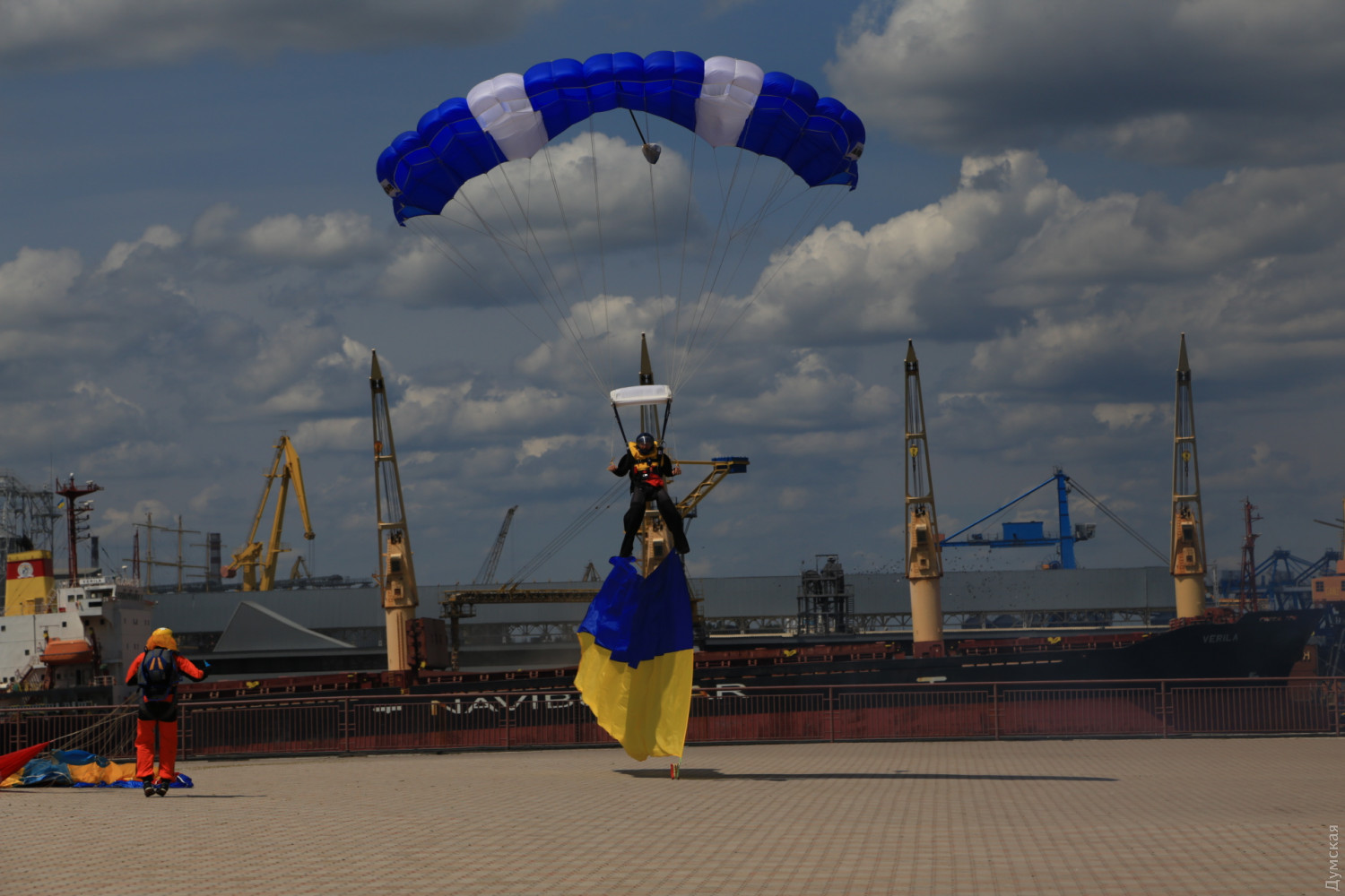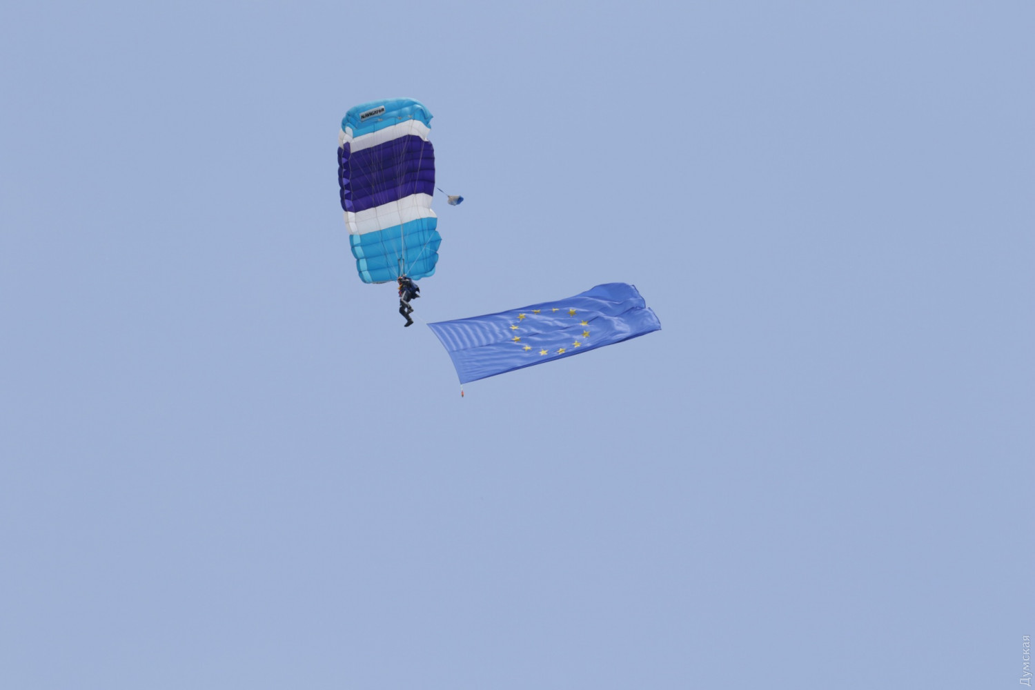 Четверка парашютистов во главе с бывшим десантником, ветераном Афганистана Константином Обориным покинули самолет на высоте 1000 метров. После раскрытия парашютов трое спортсменов развернули огромные флаги Евросоюза, Украины и Одессы. Все четверо виртуозно приземлились на небольшой майданчик между гостиницей «Одесса» и церковью Святого Николая. У всех наших парашютистов свыше тысячи прыжков, а для Константина это был 4075-й.