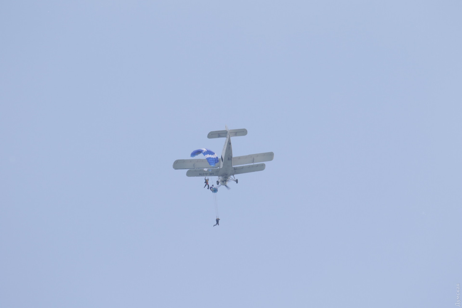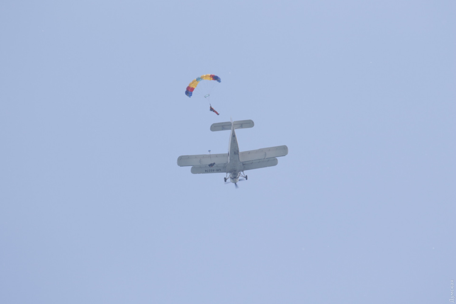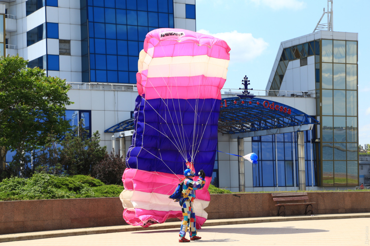 Четверка парашютистов во главе с бывшим десантником, ветераном Афганистана Константином Обориным покинули самолет на высоте 1000 метров. После раскрытия парашютов трое спортсменов развернули огромные флаги Евросоюза, Украины и Одессы. Все четверо виртуозно приземлились на небольшой майданчик между гостиницей «Одесса» и церковью Святого Николая. У всех наших парашютистов свыше тысячи прыжков, а для Константина это был 4075-й.