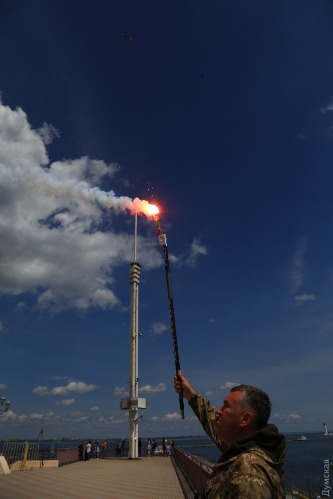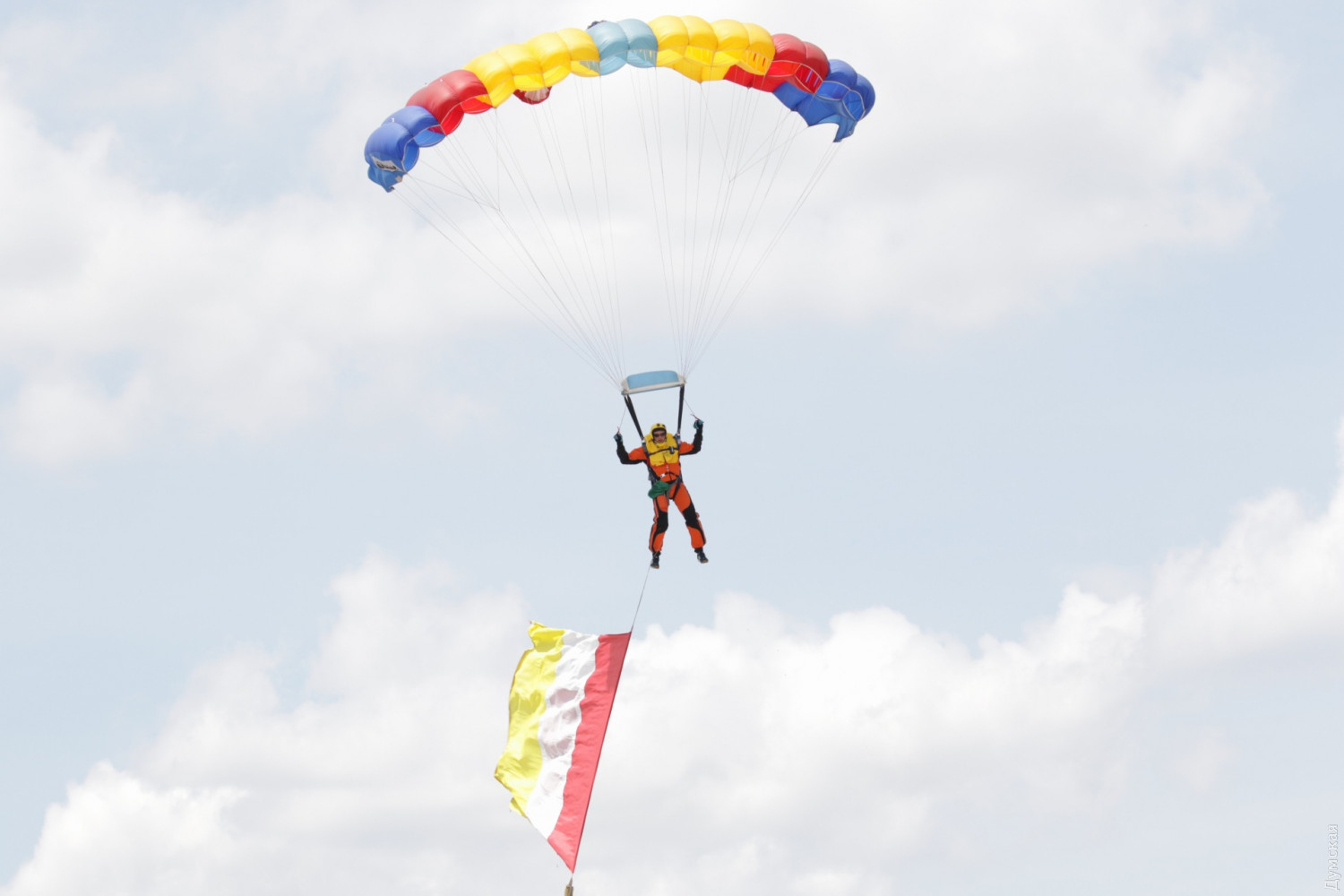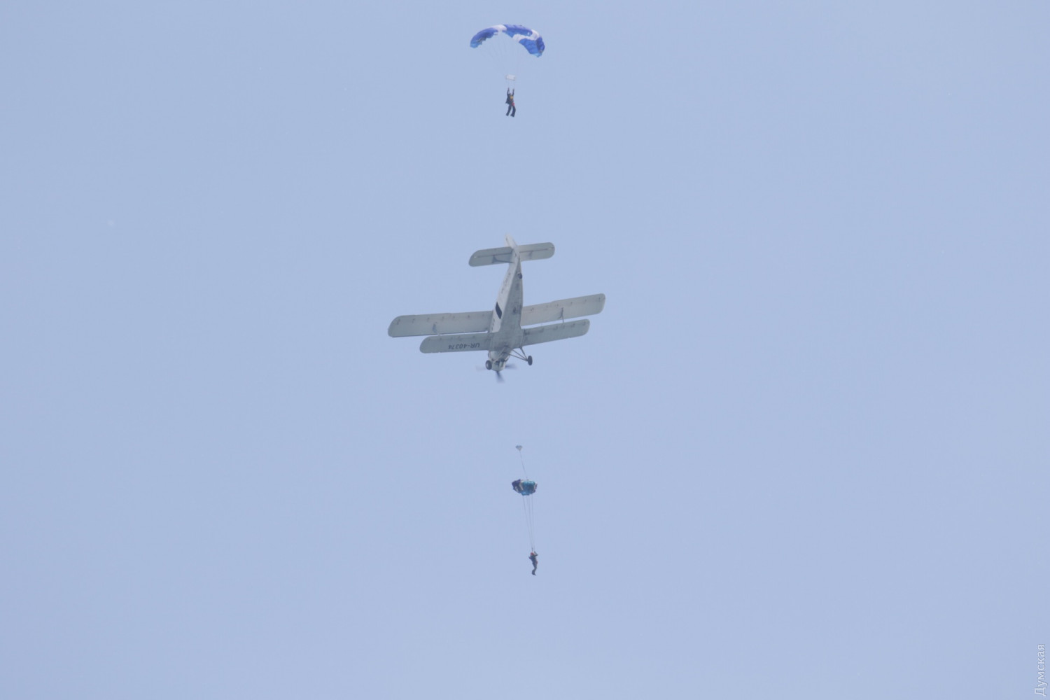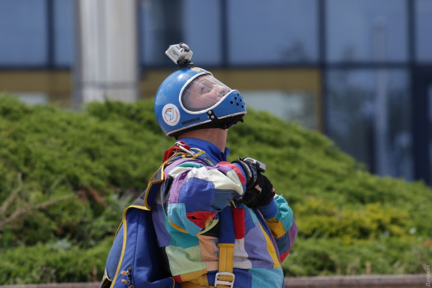 Четверка парашютистов во главе с бывшим десантником, ветераном Афганистана Константином Обориным покинули самолет на высоте 1000 метров. После раскрытия парашютов трое спортсменов развернули огромные флаги Евросоюза, Украины и Одессы. Все четверо виртуозно приземлились на небольшой майданчик между гостиницей «Одесса» и церковью Святого Николая. У всех наших парашютистов свыше тысячи прыжков, а для Константина это был 4075-й.