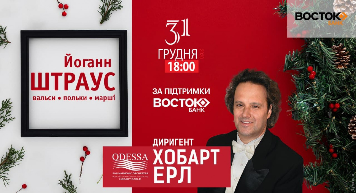 Банк Восток приглашает на новогодний онлайн-концерт Хобарта Эрла (новости компаний)31 декабря Банк Восток дарит всем ценителям классической музыки возможность присоединиться к трансляции новогоднего концерта — оркестр одесской Филармонии и главный дирижер Хобарт Эрл будут исполнять музыку «короля вальсов» Иоганна Штрауса. В течение 25 лет Национальный одесский филармонический оркестр и его руководитель Хобарт Эрл продолжают дарить одесситам и гостям города праздничное настроение своим мастерством. Маэстро Эрл учился и руководил организованным им Венским камерным оркестром, что позволило ему, в сотрудничестве с одесским оркестром, оживить очарование музыки Штрауса. «Банк Восток желает веселых праздников. Ощутите новогоднюю сказку вместе с оркестром, окунитесь в атмосферу Венского бала и подарите рождественское настроение себе и всей семье», — приглашают организаторы. Онлайн-трансляция концерта состоится 31 декабря в 18:00 на сайте Национального одесского филармонического оркестра, по ссылке https://odessaphil.org. СМЕРТЬ РОСІЙСЬКИМ ОКУПАНТАМ! Помітили помилку? Виділяйте слова з помилкою та натискайте control-enter