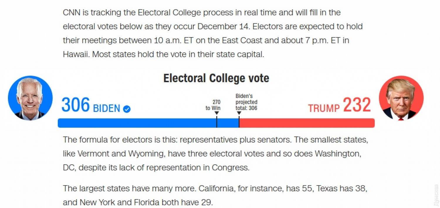 Кандидат от Демократической партии Джо Байден окончательно победил на выборах США -он выиграл голосование коллегии выборщиков, получив 306 из 270 необходимых голосов. Как передает Reuters, решающую роль в голосовании сыграл штат Калифорния. Там выборщики отдали 55 голосов за Байдена. В общем демократ получил 306 голосов против 232 за действующего президента Дональда Трампа. Поддержали бывшего вице-президента также в штатах Аризона, Джорджия, Мичиган, Невада, Пенсильвания и Висконсин, где раньше Трамп требовал пересчитать голоса. Инаугурация Байдена пройдет 20 января. Вместе с Байденом в должность вступит Камала Харрис, которая займет пост вице-президента. Интересно, что Дональд Трамп до сих пор не признает поражения и заявляет, что команда Байдена побеждает через юридические тонкости. «Они побеждают за счет мелочей, мелких формальностей — например, такую вещь как право обращения в суд. Они утверждают, что у президента США нет права быть выслушанным в суде»,- цитирует Трампа Fox News. СМЕРТЬ РОСІЙСЬКИМ ОКУПАНТАМ! Помітили помилку? Виділяйте слова з помилкою та натискайте control-enter Новини по цій темі: 19 січня 2022: Госсекретарь США Блинкен прибыл в Украину 18 січня 2022: Украину посетил директор ЦРУ, — CNN 28 грудня 2021: В оборонном бюджете США предусмотрели 300 млн долларов для Украины: Байден подписал документ 2 вересня 2021: Из-за урагана "Ида" в Нью-Йорке объявили чрезвычайное положение |
