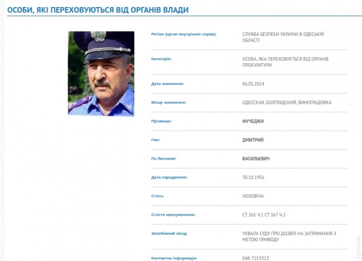 «Как сообщает в пятницу пресс-служба Генпрокуратуры Украины, при осуществлении досудебного расследования ряда уголовных правонарушений, в совершении которых подозревается Д.Фучеджи, следователи установили, что должностные лица Главного управления МВД Украины в Одесской области на протяжении октября 2014г, находясь в городе Одессе, превышая свои служебные полномочия, действуя в интересах Д.Фучеджи, «с 15 2014г находится в розыске, подали в главного управления Пенсионного фонда Украины в Одесской области заведомо ложные документы, заполненные не им, но от его имени, для назначения пенсии, то есть умышленно совершили действия, которые явно выходят за пределы предоставленных им прав и полномочий«»
